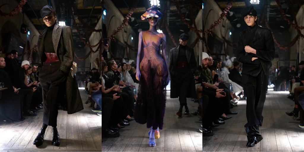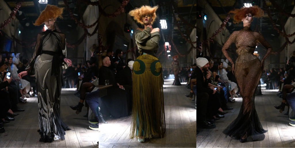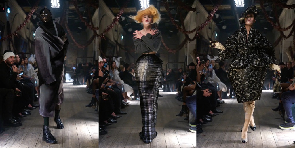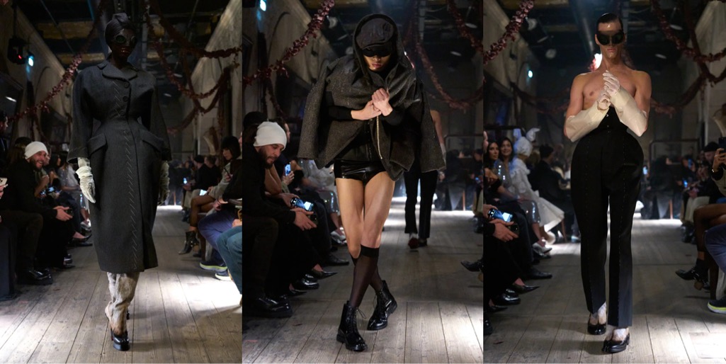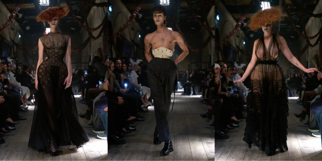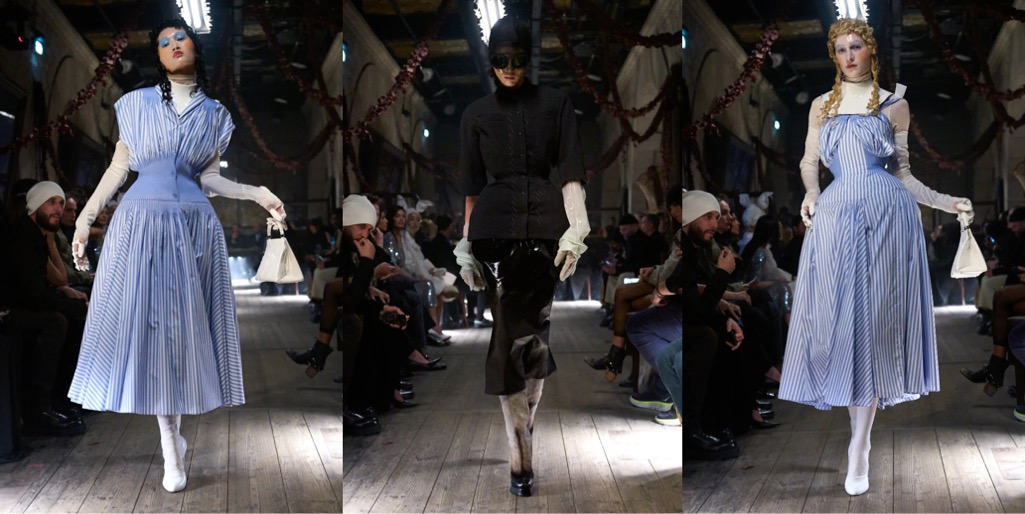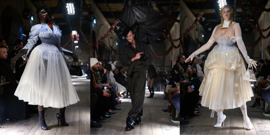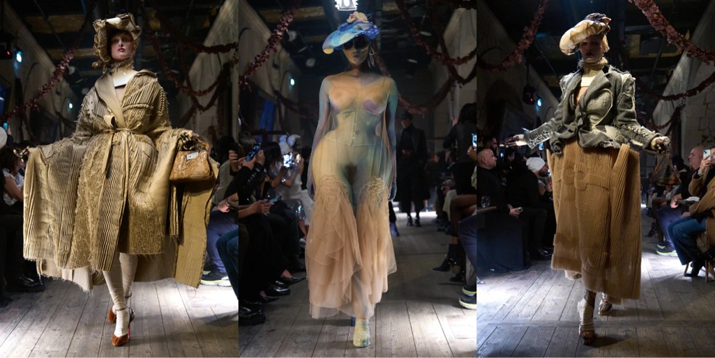 In the last couple of seasons at Margiela, it was clear that Galliano is returning back to himself as a designer. But this spring-summer 2024 couture collection feels like a total release, total encapsulation of the unhinged Galliano – even not from the Dior days, but rather the early 90s shows in Paris under his own name, that stunned with theatricality, pure romanticism and casts of model so authentic you believed you’ve been transported to a different epoque. The scene: under the Pont d’Alexandre III after dark, down rain-soaked steps, with the Seine roiling alongside, a rancid Parisian nighttime joint with bare floorboards, cafe tables, dim mirrors, and a bar overflowing with spent drinks. The runway mise-en-scène suddenly turned into a living Brassai’s 1920s and ’30s portraits of the night-time underbelly of Paris’s clubs and streets. Galliano’s transferences into cutting, ultra-extreme corsetry, padded hips, erotically sheer lace dresses, and wildly imaginative hair, chiffon-masked makeup, and eerie doll-like body-modifications took a year. A year to work on a production that seamlessly mixed film – which played in the mirrors – into the scenario, showing lovers, dancers, and gangsters prowling the banks of the Seine. To make it seem that these strutting denizens, fugitives from fights, or half-dressed from sexual encounters, clutching their moon-bleached coats or scrappy cardigans around them were actually congregating from the riverside and into the club before our eyes. Through some of Galliano’s beautifully delicate hourglass dresses there was pubic hair to be seen through tulle and lace (they were merkins on underwear, but still bound to stir up a storm). Some of his indescribable techniques looked almost like walking paintings, greenish-pink watercolor nudes with blurry dabs for eyes. All the images and impressions from this show will be burned on the mind’s eye for many reasons and many years.