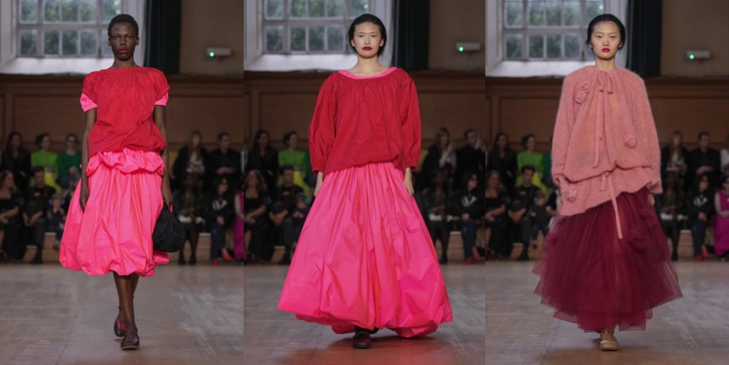 Molly Goddard‘s design language, consisting of signature tulle and romantic, magpie aesthetic, takes a beautiful, somewhat experimental turn for autumn-winter 2024. The play of volumes makes you think of the sensational Junya Watanabe’s 2000 “Techno Couture“ collection which was all about exaggerated, honeycomb ruffs inspired with European portraiture of nobility. Like some extraordinary dolls wrapped in layers and layers of tulle, the Goddard models could easily appear on the set of Yorgos Lanthimos’ “Poor Things“. Then there were all these charming cowgirl motifs, like embroidered roses on collars and full-skirts covered in XXL polka-dots, kept in a vivacious color palette taken straight out of a Pedro Almodovar film. Not every designer could pull off such portion of eclecticism and make it all look somehow consistent. But Molly Goddard is a creative who finds method in the madness.