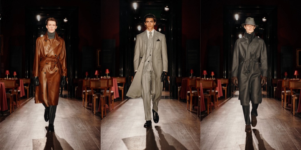 At Dunhill, an unexpected surprise: the British dandy’s wardrobe gets a refreshment. Simon Holloway‘s debut collection felt like a much-needed wake-up call for this sleepy, London-based brand. The salon-inspired show unfolded at the National Portrait Gallery, transforming it into an elegant, cozy setting reminiscent of a chic café. As a swarm of very fine models emerged, the collection emanated a decidedly classic feel. This setting aptly matched the preppy mood that permeated the garments that felt quintessentially Dunhill. But with a closer look, a majority of pieces were lightweight, and the purposefully mismatched details within the prints and textures felt more modern than was first apparent. There were suits upon suits: two-piece cashmere wool sets here, fabulously cut Donegal tweed three-piece concoctions there. Reinventing the car coat, a nod to house founder Alfred Dunhill’s heritage, the outerwear range varied from camel hair with leather accents to premium double-faced wool. When asked about his intentions in translating Dunhill’s 130-year legacy to a contemporary London audience, Holloway’s response was assured: “There are menswear enthusiasts here, some of whom, particularly older generations, may know Dunhill from the past. But I do think there’s a younger audience obsessed with tailoring and proper menswear haberdashery – it’s a lovely thing to be able to connect with them here, too.”