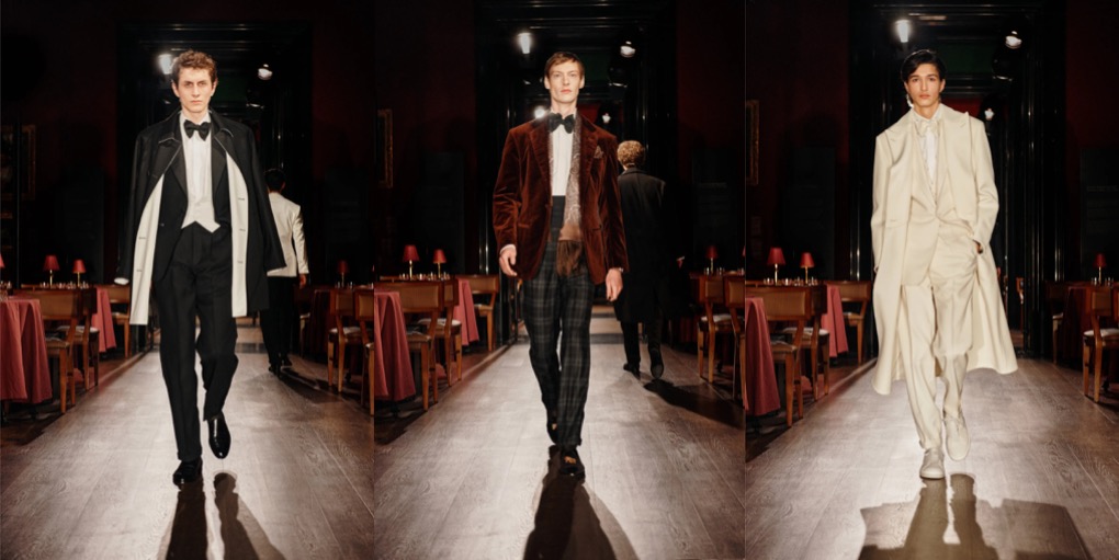 At Dunhill, an unexpected surprise: the British dandy’s wardrobe gets a refreshment. Simon Holloway‘s debut collection felt like a much-needed wake-up call for this sleepy, London-based brand. The salon-inspired show unfolded at the National Portrait Gallery, transforming it into an elegant, cozy setting reminiscent of a chic café. As a swarm of very fine models emerged, the collection emanated a decidedly classic feel. This setting aptly matched the preppy mood that permeated the garments that felt quintessentially Dunhill. But with a closer look, a majority of pieces were lightweight, and the purposefully mismatched details within the prints and textures felt more modern than was first apparent. There were suits upon suits: two-piece cashmere wool sets here, fabulously cut Donegal tweed three-piece concoctions there. Reinventing the car coat, a nod to house founder Alfred Dunhill’s heritage, the outerwear range varied from camel hair with leather accents to premium double-faced wool. When asked about his intentions in translating Dunhill’s 130-year legacy to a contemporary London audience, Holloway’s response was assured: “There are menswear enthusiasts here, some of whom, particularly older generations, may know Dunhill from the past. But I do think there’s a younger audience obsessed with tailoring and proper menswear haberdashery – it’s a lovely thing to be able to connect with them here, too.”