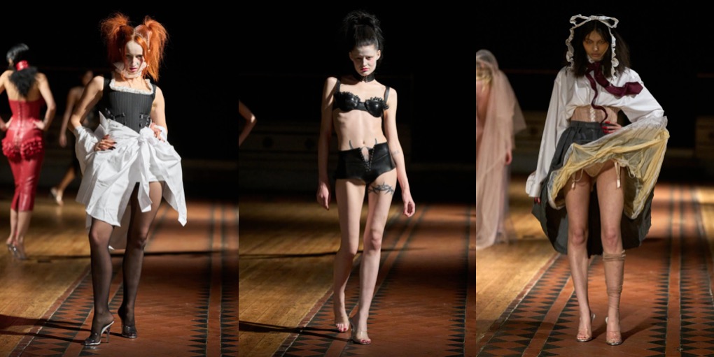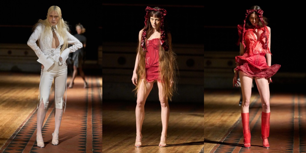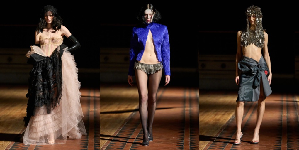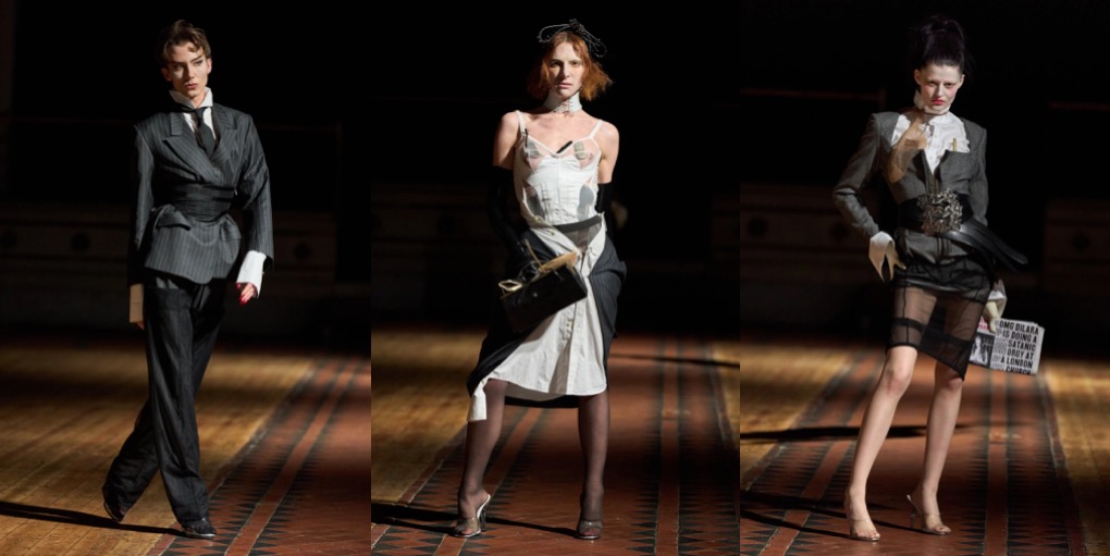 “It’s about toxic masculinity – and being beyond it: I feel like tonight we are doing a mass ritual to end it. The collection is called Femme Vortex because I wanted to create a different reality, outside politics, borders, gender norms, any kind of systematic rules that have been created by hetero-patriarchal men. My previous collections were about fighting, about resistance. But I’m not fighting any more: I wanted to express divine feminine power somewhere beyond time, beyond reality, and beyond what is happening.” That’s the manifesto behind Dilara Findikoglu‘s autumn-winter 2024 show presented at a moody church in London. All 37 looks had a title, and were crafted to encapsulate the spirit of a Findikoglu-conceived character through costume. The models then inhabited them, accepting the possession of that spirit through the prism of their own individuality. Hari Nef, being “Female Territory“, wore a corporate suit, usurped and transformed. Its pinstripe wool and cotton shirting was deployed as a split skirt worn beneath corseting, latex opera gloves, and a BDSM bow headpiece. Other looks, including number three’s “Man License“, were accessorized with a tabloid newspaper whose splash headline ran: “OMG Dilara Is Doing a Satanic Orgy at a London Church.” Others, such as “Fragile Ego“, and the final two looks were made of stiffened fabric apparently mid-flutter (or wrenched) as if to appear frozen in time. We still have to see what’s cooking at Sean McGirr’s Alexander McQueen debut collection, but I feel like Dilara would do absolute wonders under Lee’s name.