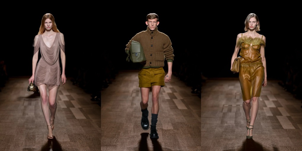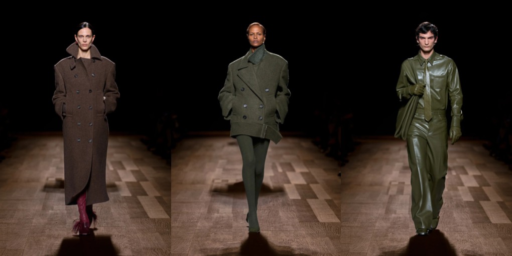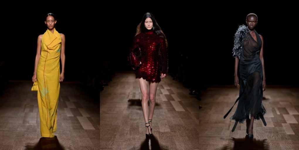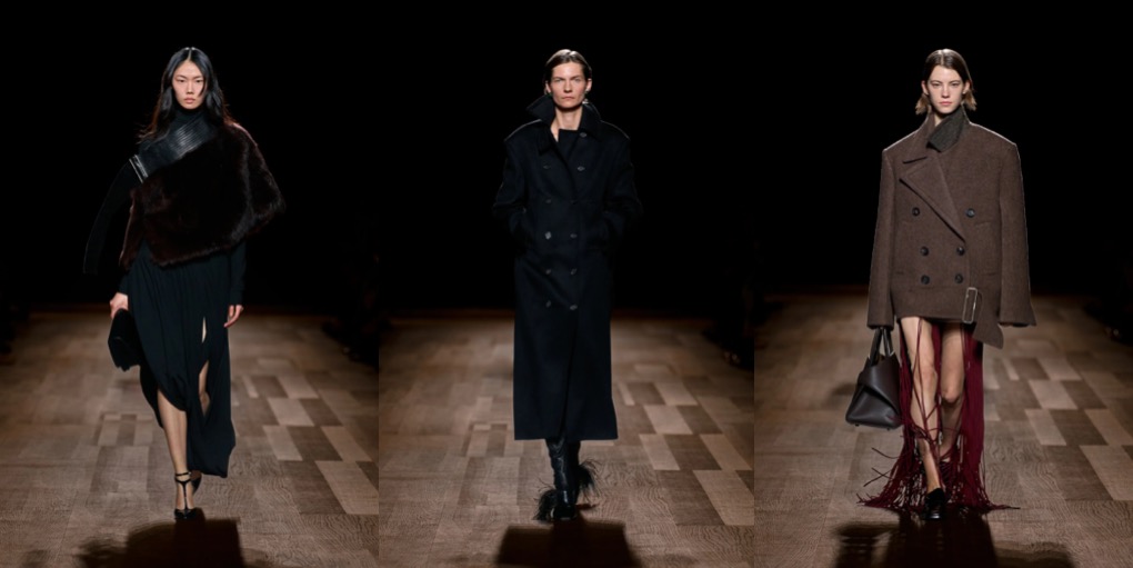Now on his fourth collection for Ferragamo, Maximilian Davis‘ vision of the brand is coded with some distinct signifiers. Once again, Davis found inspiration in the brand’s founding decade, saying “the 1920s used clothing as a way to celebrate freedom. And that expression of freedom is something that resonates with me, my heritage, and with Ferragamo.” Visual references to the 1920s – raised hems, fluid fabrics, touches of fringe, relaxed cuts and dropped waists – reflected the “era of emancipation,” modernized with masculine cuts, utilitarian elements, and Lotta Volkova’s styling. As a result, this particular expression of freedom through clothing was one anchored in shape, with a strong focus on sleek eveningwear, drapery and structured tailoring. There were two lovely shimmering flapper dresses that appeared to be adorned with thick fish scale-style sequins, which were meticulously constructed from leather covered in a special metallic finish. Throughout, these hyperfeminine sensibilities – like sensual, sheer touches – were juxtaposed with masculine shoulders, thick knit jumpers and fisherman wader-style boots. Davis is intrigued by Old Hollywood, given Salvatore Ferragamo’s history with actresses; autumn-winter 2024 is a singular homage to ’20s icons like Joan Crawford and Greta Garbo.