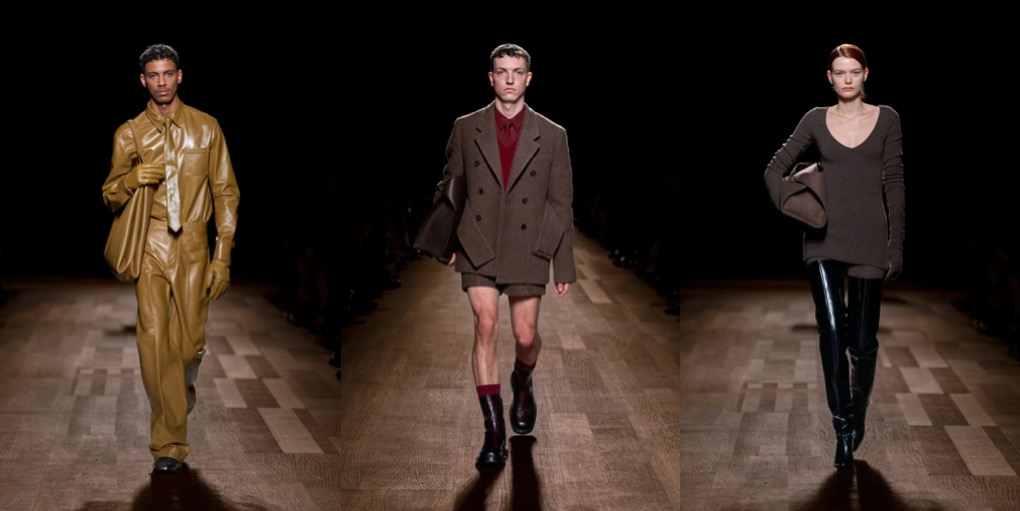 Now on his fourth collection for Ferragamo, Maximilian Davis‘ vision of the brand is coded with some distinct signifiers. Once again, Davis found inspiration in the brand’s founding decade, saying “the 1920s used clothing as a way to celebrate freedom. And that expression of freedom is something that resonates with me, my heritage, and with Ferragamo.” Visual references to the 1920s – raised hems, fluid fabrics, touches of fringe, relaxed cuts and dropped waists – reflected the “era of emancipation,” modernized with masculine cuts, utilitarian elements, and Lotta Volkova’s styling. As a result, this particular expression of freedom through clothing was one anchored in shape, with a strong focus on sleek eveningwear, drapery and structured tailoring. There were two lovely shimmering flapper dresses that appeared to be adorned with thick fish scale-style sequins, which were meticulously constructed from leather covered in a special metallic finish. Throughout, these hyperfeminine sensibilities – like sensual, sheer touches – were juxtaposed with masculine shoulders, thick knit jumpers and fisherman wader-style boots. Davis is intrigued by Old Hollywood, given Salvatore Ferragamo’s history with actresses; autumn-winter 2024 is a singular homage to ’20s icons like Joan Crawford and Greta Garbo.