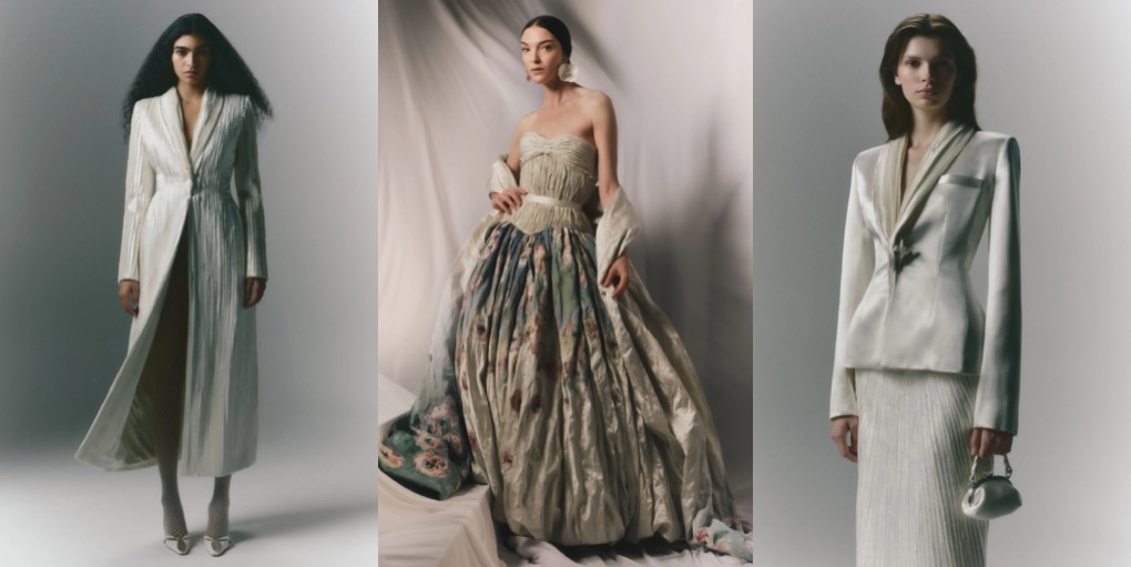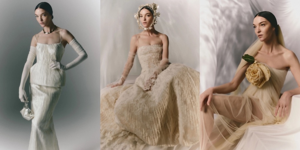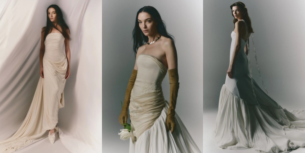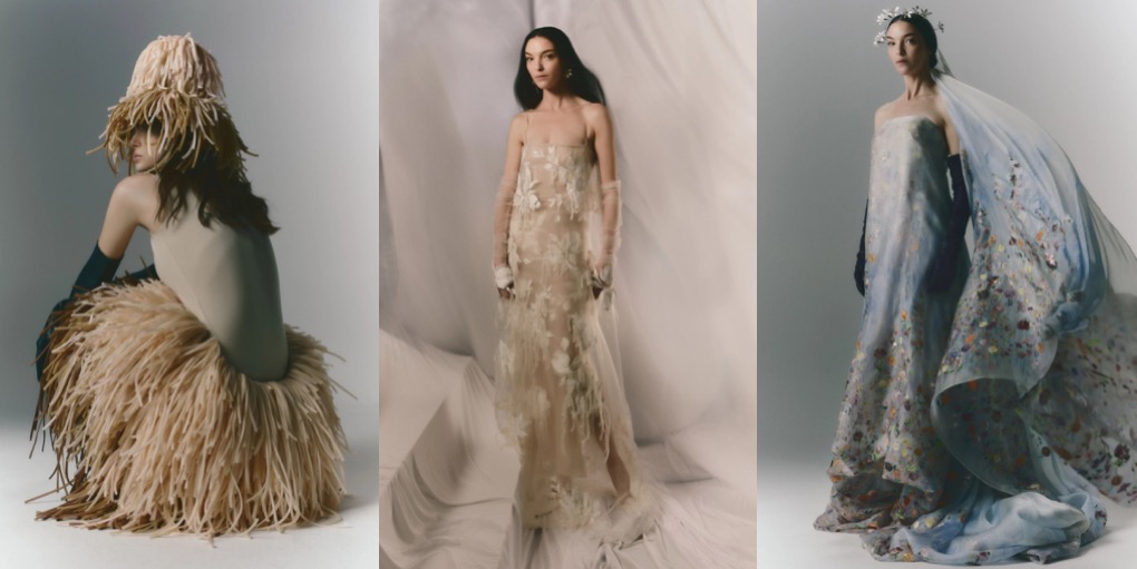 If there’s one designer that leads the bridalwear game today, then it’s definitely Danielle Frankel and her New York-based studio. However Danielle isn’t limiting her designs to weddings only; she describes her namesake brand as “a fashion label” whose “medium is bridal,” a minor yet important distinction that indeed manages to capture her stunning creative output. The latest collection, starring Italian beauty Mariacarla Boscono and styled by Vanessa Traina, is an in-depth study of texture, unique fabrications, and gesturally arranged flowers lead to a sort of accidental Impressionism. The brand’s signature interplay of hard and soft and its relaxed refinement join pointedly feminine details that are naturally mussed at the edges. Oil-on-canvas landscapes are interpreted by hand-painted petit-fleurs, watercolor prints, and sculpted blooms. Painterly brushstrokes adorn featherweight organza juxtaposed by castings of metal and clay blossoms created by artisans in Ukraine and South Africa. The introduction of silk jersey brings a goddess-like liquidity to the range, while the addition of Lyon lace elevates an exploration of sheerness and structure. Silk woven with metal fibers creates beautiful wrinkles that are meant to last rather than be pressed away; a sort of “perfect imperfection“. In a continued exploration of color for the aisle, alabaster is joined by patinaed rust, hibiscus, citrus, pale chrysanthemum (Frankel’s favorite) and various shades of ivory. Degradé-dyed and pearl-tipped organza fringes mimic grasses in the hand-brushed expanses that inspired them. This really isn’t your average bride-to-be wardrobe.