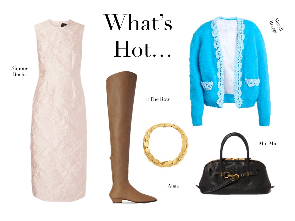 What’s Hot (7.8.24) August 7, 2024August 4, 2024 | Design & Culture by Ed Simone Rocha Crinkled Cloqué Midi Dress Alaia Goldtone Layered Leaf Necklace The Row Billie Over-the-knee Boots Miu Miu Padded Leather Top-Handle Bag Related