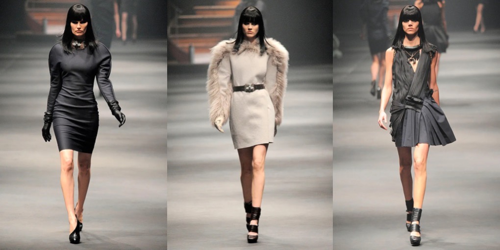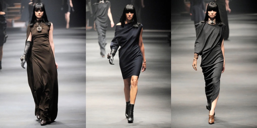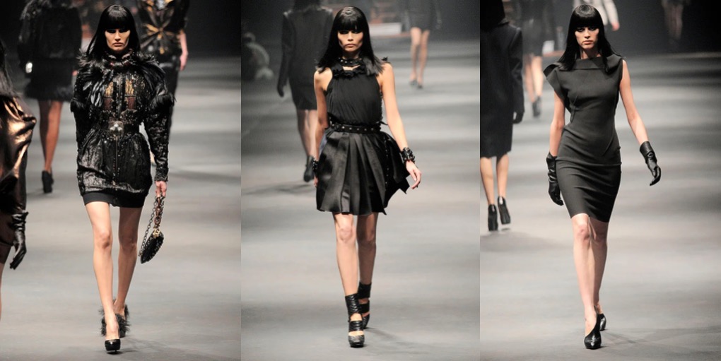 Lately I’m feeling very sentimental for the late Alber Elbaz‘s Lanvin. Maybe it’s also the anticipation for Peter Copping’s (hopeful) revival of the Parisian house. But I truly miss Elbaz and his incredible, unmatched approach to dress-making. The autumn-winter 2010 collection is one of my all-time favorite Alber for Lanvin moments. For day, it began with no-nonsense, clean silhouettes cut from matte stretch materials with a molded structure (see Magdalena Frąckowiak’s look!); dresses and coats were cut roomy in the shoulder, tapering to sensually clutch the hips. The eveningwear, consisting of simple jersey togas, was just so sublime. But with Elbaz, you always had minimalist ideas clashed with the joy of maximalism. The technical starkness of the collection was gradually steered away with the addition of chunky metal and rock-crystal jewelry, ostrich feather, sheer lace, and beaded spine-tracing zippers, building up to dynamic feats of diagonal pleating that crossed the torso in one direction and shot across the hips in the other. Dark, yet sensational glamour at its best.