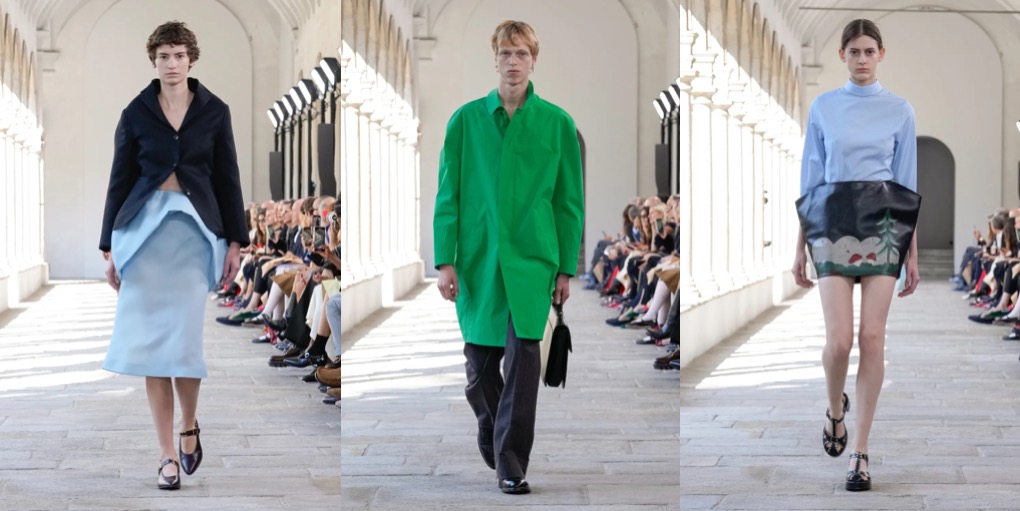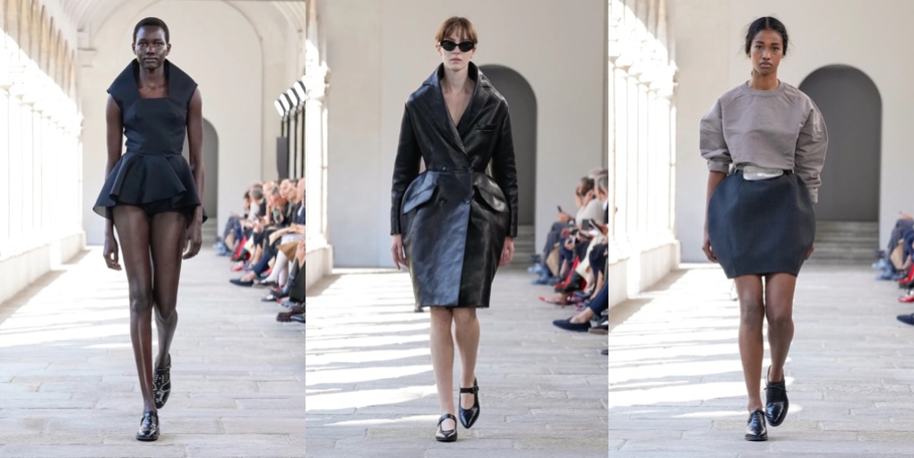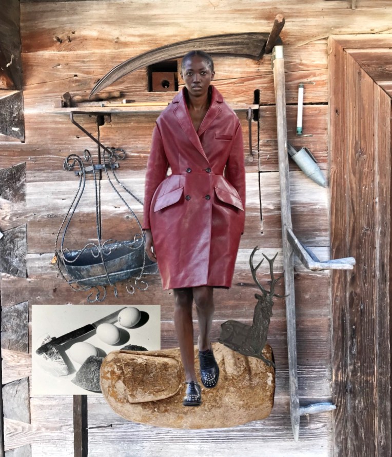 In my opinion, the silent revolution going on at Bally is the most exciting phenomenon in Milan. Simone Bellotti’s vision of the brand very smartly – and with lots of wit – references Switzerland, the homeland of Bally. On the spring-summer 2025 moodboard, he had an eclectic mix of imagery, but one portrait stood out, that of Hugo Ball, the sound-poetry author and founder of the Dada movement in 1916 Zürich. Surrounding Ball’s image were photos of rustic, oddly-shaped cowbells, rusted shoehorns, and Man Ray’s artwork The Gift – a flat iron with thumbtacks glued along its sole. What captivated Bellotti about Ball’s portrait was the striking costume: a tall cylindrical hat and a metallic cone-shaped cape, with a stiff high collar framing his face. “I like its simple precision,” Bellotti remarked. Bellotti revisited the mountain-like, sloped-shoulder silhouette throughout the collection, integrating it into the necklines of coats and blazers. In some ensembles, this shape was paired with curved lines inspired by cowbells, reinterpreted as rounded miniskirts – some of which were lifted at the front to reveal matching culottes beneath. The concept was great, but the effect looked ill-fitting most of the time. Still, there was a standout piece: a burgundy leather coat featuring a sloped collar and shoulders, with a cinched waist that flared into a poufy pannier skirt (very Prada autumn-winter 2009).