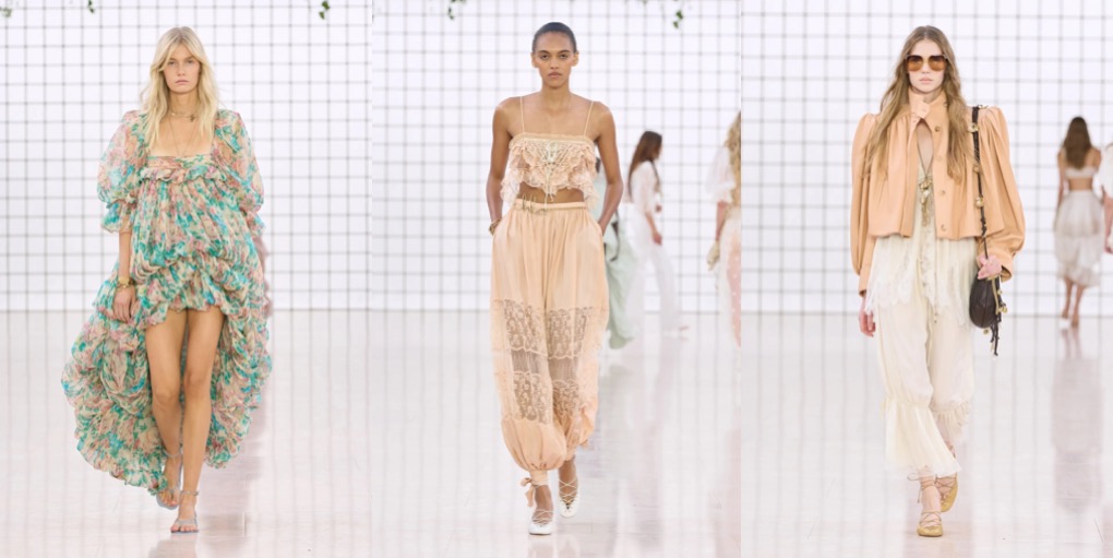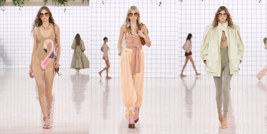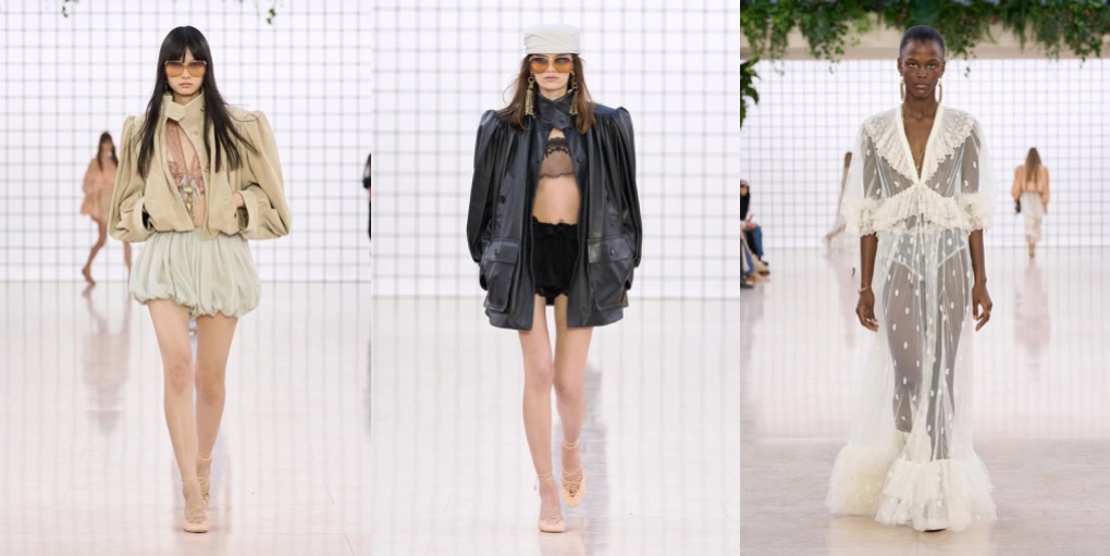 Chemena Kamali is on a roll. It’s her second full season at Chloé, and the way her take on the brand resonates with the industry – and clients who are literally storming the boutiques in Paris! – is a rare thing to see nowadays. Also, comparing to other designers this season, she presented a proper, summer collection that actually felt summer-ish. And just like in her confident debut, Kamali once again showcases her intimate understanding of Chloé’s history. Photos of Karl Lagerfeld designed collections were pinned to the mood board in her studio. Two of her most inspired lifts were the waist shapers of spring 1977 and the lace bloomers of spring 1978. Jackets – in sturdy workwear cotton or soft suede – gave the sensual lightness of these pieces a reality check. It’s good to see flou femininity back on Chloé runway – for some reason, Kamali’s predecessors thought it wasn’t the right thing to channel. But there’s a new sense of strength in these carefree girls and women wearing floral-bouquet-print dresses in cascades of ruffled chiffon.