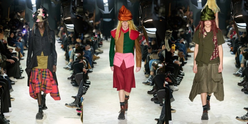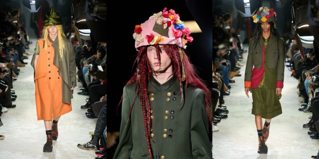 The autumn-winter 2025 collection from the menswear Homme Plus line had a loud, clear statement: “To hell with war”. Confronting the reality that young boys and men are being called up for army service, being sent to kill or be killed by countries across the world, can easily fall dumb-flat in case of fashion. But not when Kawakubo does it, so poignantly and movingly. And in any case, her position was straightforward: her young Comme soldiers are peaceniks. Their metal hats self-decorated with flowers or wrapped in fancy, vintage fabrics felt naive, but in a heart-warming, hopeful way. In their deconstructed field jackets and brass-buttoned army officer’s uniforms, they were “soldiers of love”, as Sade once sang.