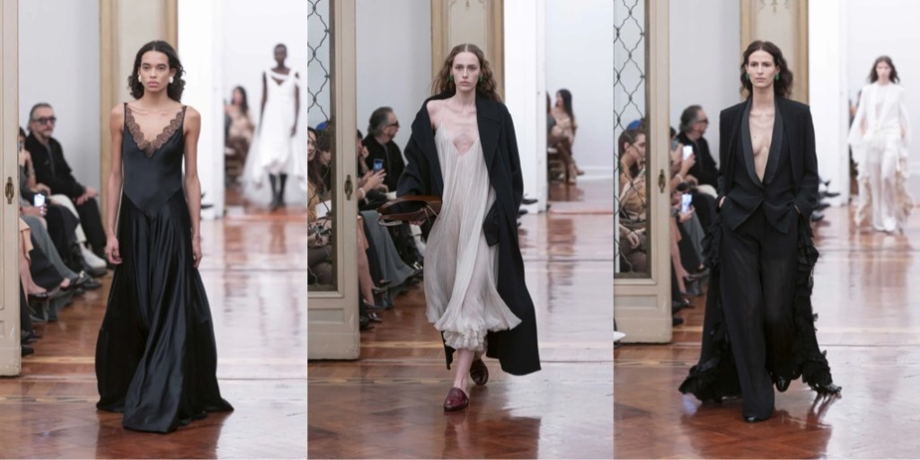 Lorenzo Serafini‘s debut collection for Alberta Ferretti wasn’t the loudest, but certainly was persuasive. “It is the big dreams that make people big. Small ones are desires. One should not be afraid to be ‘exaggerated’… at least in dreams.” Serafini used this beautiful Franca Sozzani quote in the notes for a show that represented, for him, the actualization of a very big dream: his new role at the Milan-based brand founded in 1981. The Sozzani factor was thanks to the late great Vogue Italia’s friendship with Ferretti, and her inspirational status for Serafini. Alongside the founder, Sozzani acted as the spiritual muse for this collection. You could actually imagine these dreamy, billow-y gowns and oversized suits on the pages of Franca’s Vogue, maybe photographed by Sarah Moon or Paolo Roversi. Serafini also delivered some of the most fascinating evening numbers we’ve seen this season – especially the unobvious-looking draped dresses that had a little of Romeo Gigli in them.