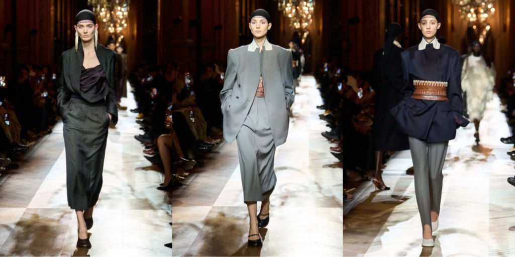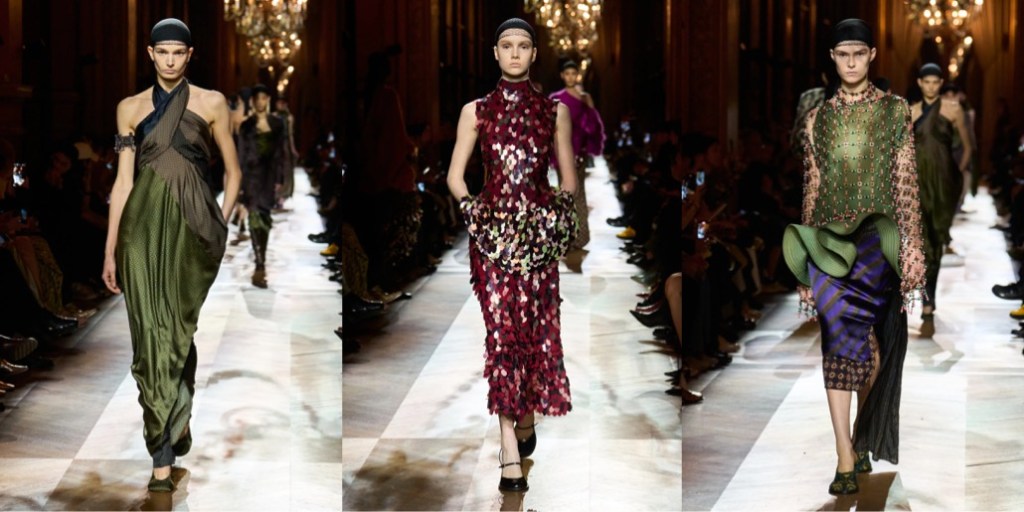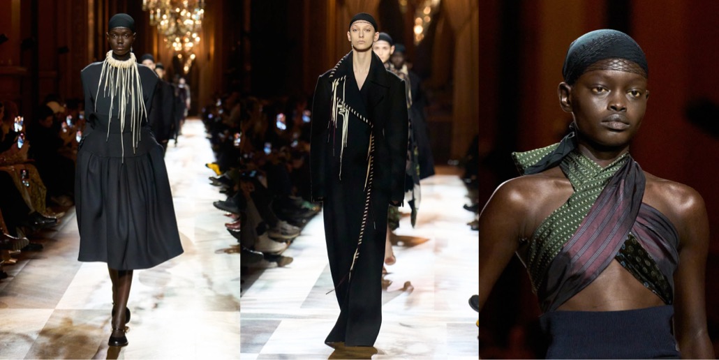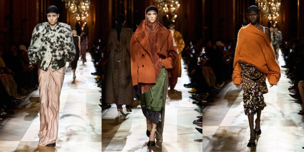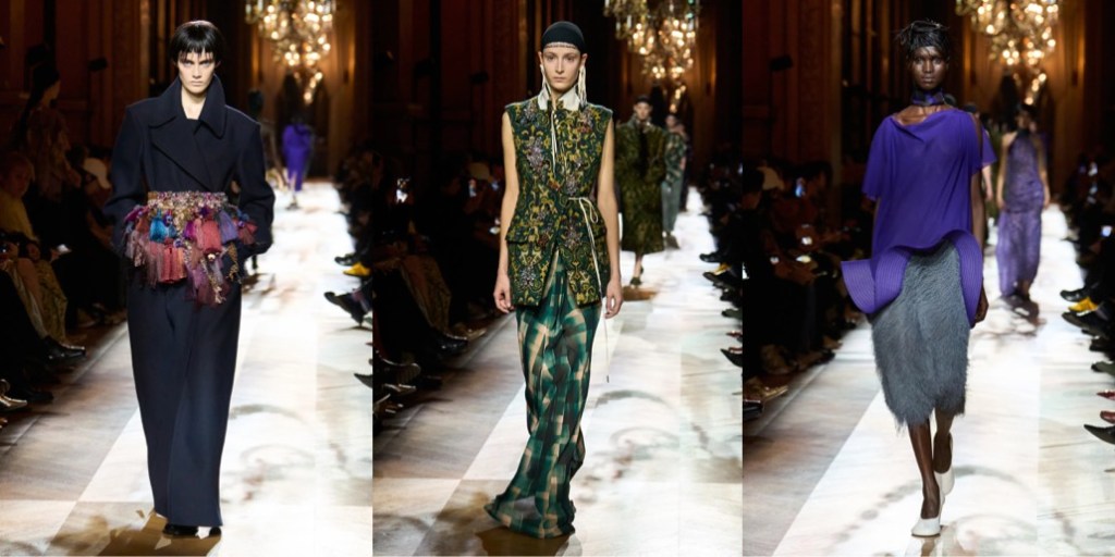 Julian Klausner‘s debut runway collection for Dries Van Noten felt familiar – in a good way. It largely did feel like a Dries collection, maybe except for the tasseled jacket and evening dress near the show’s finale. The meaty, chunky knits, beautifully layered tailoring and omnipresent play with sumptuous textures made this line-up feel like an ode to the founder of the brand – and his very, very loyal clients who went through a spiritual crisis once the designer announced his departure. Klausner isn’t planning to erase the Dries Van Noten ethos, but prolong it. The broad-shouldered coat in transfixing cardinal purple or the stunning, fluid-like dress with a green velvet bow at the neck are the best proves for his great intentions.