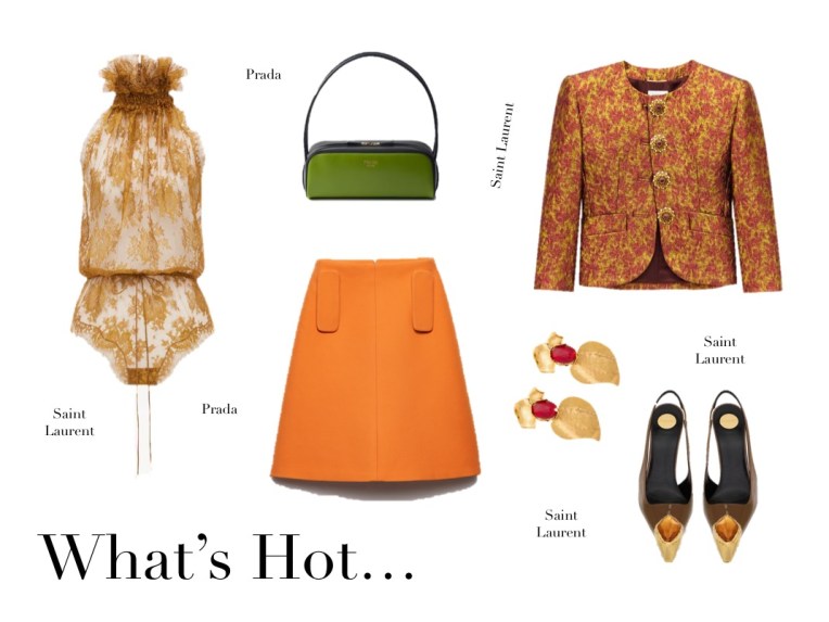 What’s Hot (22.3.25) March 22, 2025 | Design & Culture by Ed Saint Laurent Belted Jacquard Coat Saint Laurent Lace-trimmed Ribbed Silk Tank Gabriela Hearst Tate Skirt in Fluorescent Orange Aloe Linen PradaFlou Zip Leather Top-Handle Bag Saint Laurent Gold-tone, Resin, Faux Pearl And Crystal Clip Earrings Saint Laurent Glossed-leather Point-toe Pumps Related