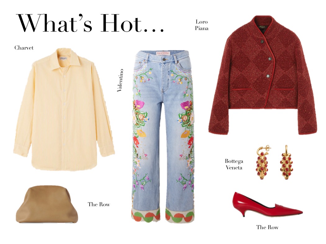 What’s Hot (11.4.25) April 11, 2025 | Design & Culture by Ed GET THE LOOK: Charvet Striped Cotton-poplin Shirt Valentino Garavani Bead-embellished Embroidered High-rise Straight-leg Jeans Posse Marley Quilted Velvet Jacket The Row Bourse Small Clutch in Small Grained Calfskin The Row Viv Leather Pumps Bottega Veneta Carnelian 18K Gold-Finish Earrings Related