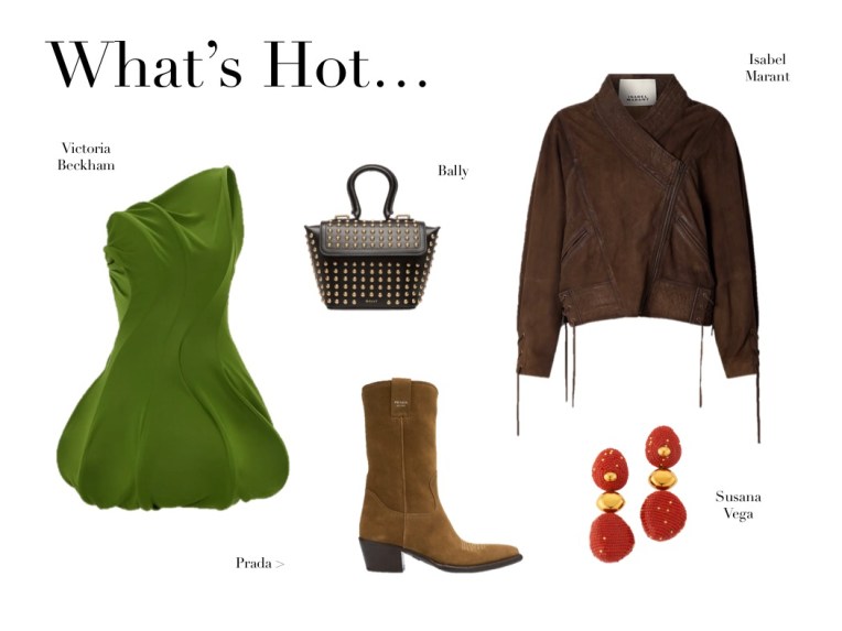 What’s Hot (16.4.25) April 16, 2025 | Design & Culture by Ed GET THE LOOK: Isabel Marant Edina Lace-up Suede Jacket Susana Vega Fiamma Earrings with Detachable Drops Prada Distressed Calfskin Short Cowboy Boots Bally Beckett Flat Medium Studded Glossed-leather Shoulder Bag Victoria Beckham Gathered Satin Mini Dress Related
