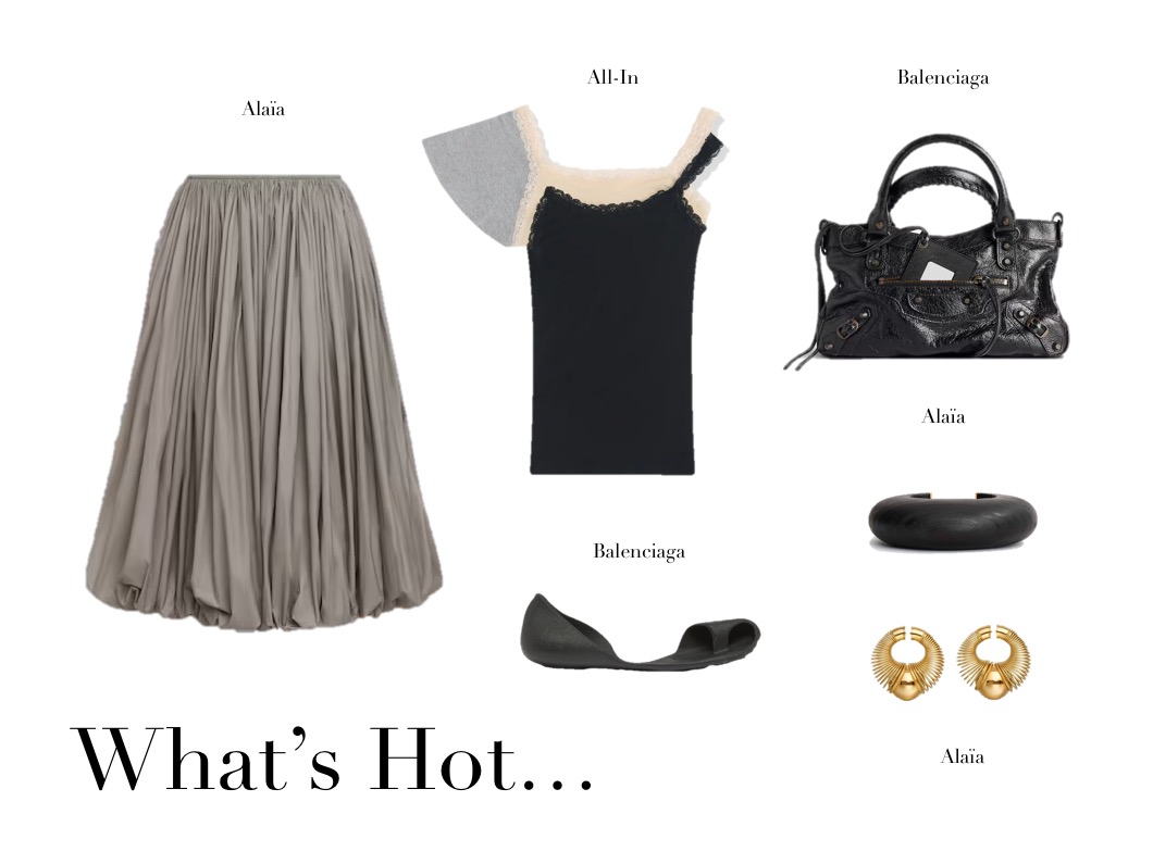 What’s Hot (25.5.25) May 25, 2025 | Design & Culture by Ed GET THE LOOK: Alaïa Bumper Wood Cuff Alaïa Gold-tone Hoop Earrings COS Belted Wool Wrap Skirt in Grey Balenciaga Bow-detailed Layered Lace-trimmed Satin And Jersey Top Balenciaga Le City Nano Textured-leather Tote Balenciaga Technoclog Rubber Mules Related