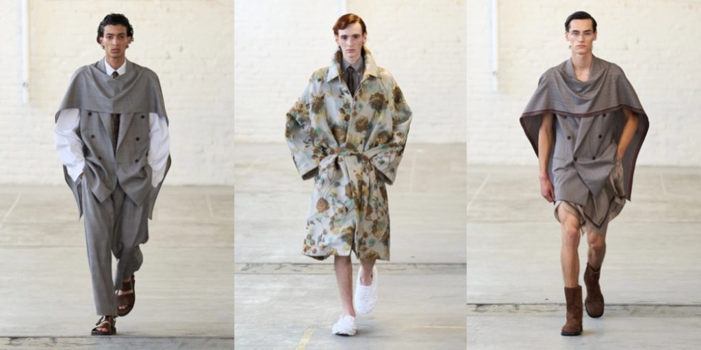 For spring-summer 2026, Hed Mayner sheds structured, voluminous layers – and opens up to a “sense of skin“. “I wanted to have something that is suspended from the body,” he said, “that when you move, it fills you with air.” The designer delivered on the promise: his signature, cocooning silhouettes never looked that refreshingly breezy and sumptuously light. A standout were his handkerchief-hem bottoms; they billowed as they walked and represented the joy Mayner has found in this new exploration. He also brought cool, buoyant languidness to his jackets, now with draped capelets that do intriguing, draped magic around the arms. The designer recently moved to Italy: it shows in the collection’s sweet nonchalance.