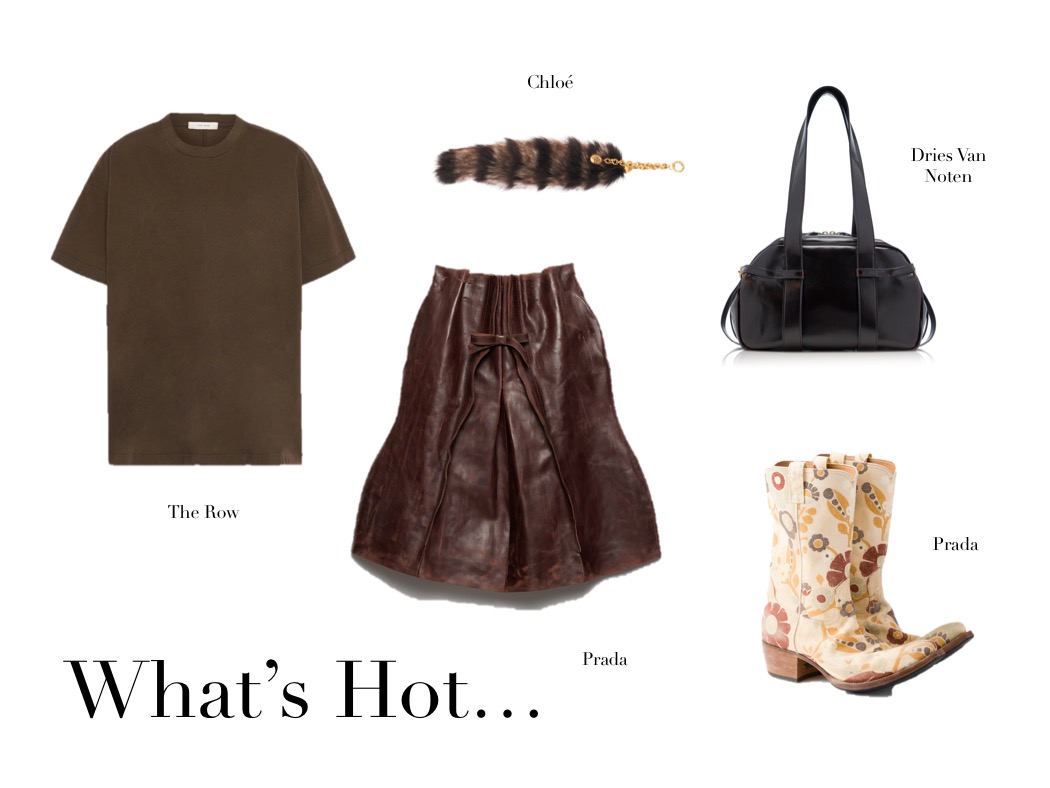 What’s Hot (12.8.25) August 12, 2025 | Design & Culture by Ed GET THE LOOK: The Row Kota Jersey T-shirt BY MALENE BIRGER Lunes Paneled Leather Midi Skirt Prada Texani Suede Western Boots Dries Van Noten Leather Shoulder Bag Related