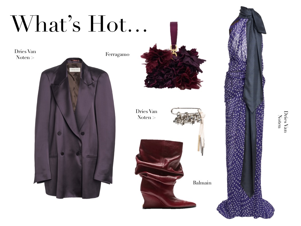 What’s Hot (25.10.25) October 25, 2025October 24, 2025 | Design & Culture by Ed GET THE LOOK: Dries Van Noten Velvet-trimmed Gathered Printed Crepe De Chine Halterneck Blouse Dries Van Noten Devoré-velvet Maxi Skirt Dries Van Noten Wool-twill Blazer Balmain Textured-leather Over-the-knee Boots Ferragamo Patent-leather Clutch Dries Van Noten Silver- And Gold-tone Brooch Related