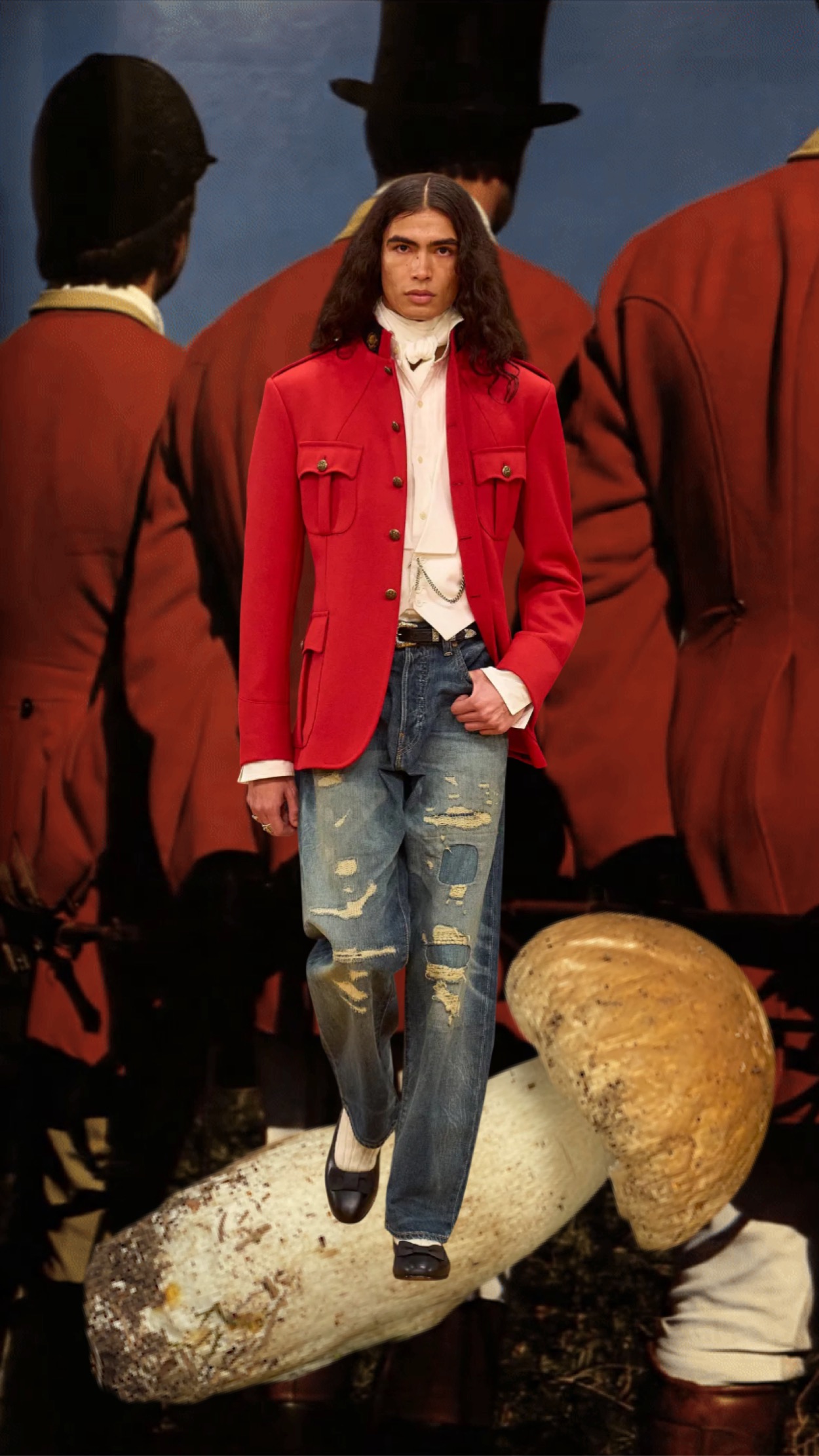 Tailoring was characteristically cut in a carefully baggy silhouette: the Hayworth, designed to echo the inclination Lauren’s team observed among young collectors of the brand’s vintage pieces. The collection then shifted into a gentleman-adventurer mode, with highlights including a cream shearling utility parka and a tuxedo-black airman’s jumpsuit worn over an evening shirt and tie, cinched with a hand-tooled Western belt. And my personal favorite? A British Army–inspired red coat worn with ripped jeans and opera shoes.