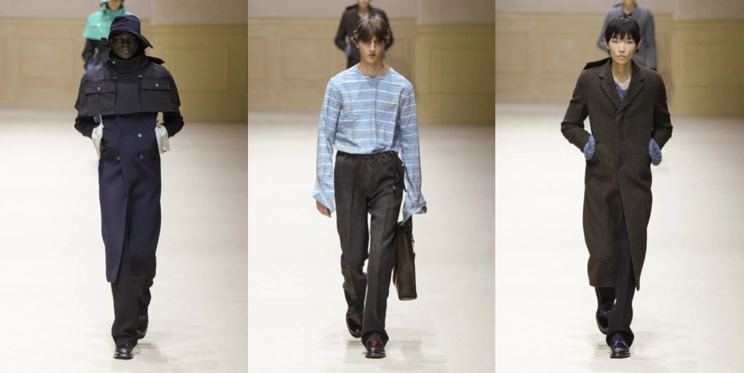 Miuccia Prada and Raf Simons’s joint effort at Prada may not have been conservative in concept, but it unmistakably foreshadowed recession – economic, political, cultural. The show venue at Fondazione Prada resembled a ruined palace or temple constructed from spolia. The clothes sent down the runway – on models decidedly less hunky than those seen at other houses – bore visible signs of distress. Slender, waist-cinched jackets were deliberately creased, their worn wool appearing raw and coarse. A beige leather coat was frayed at the edges, as though it had been worn – and lived in – for decades.