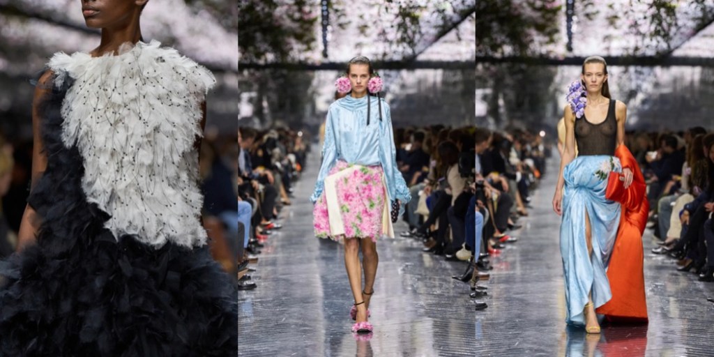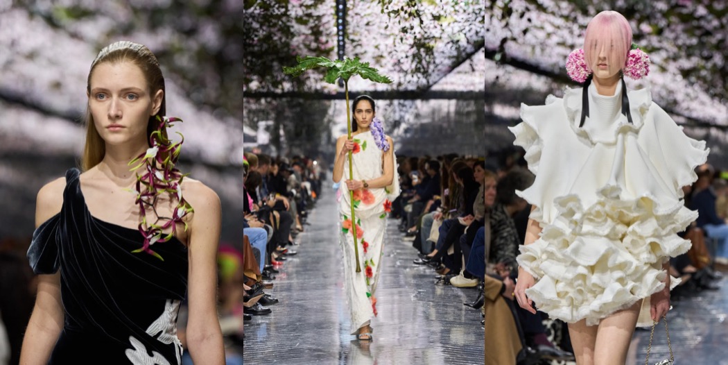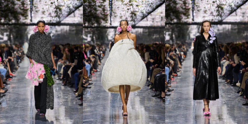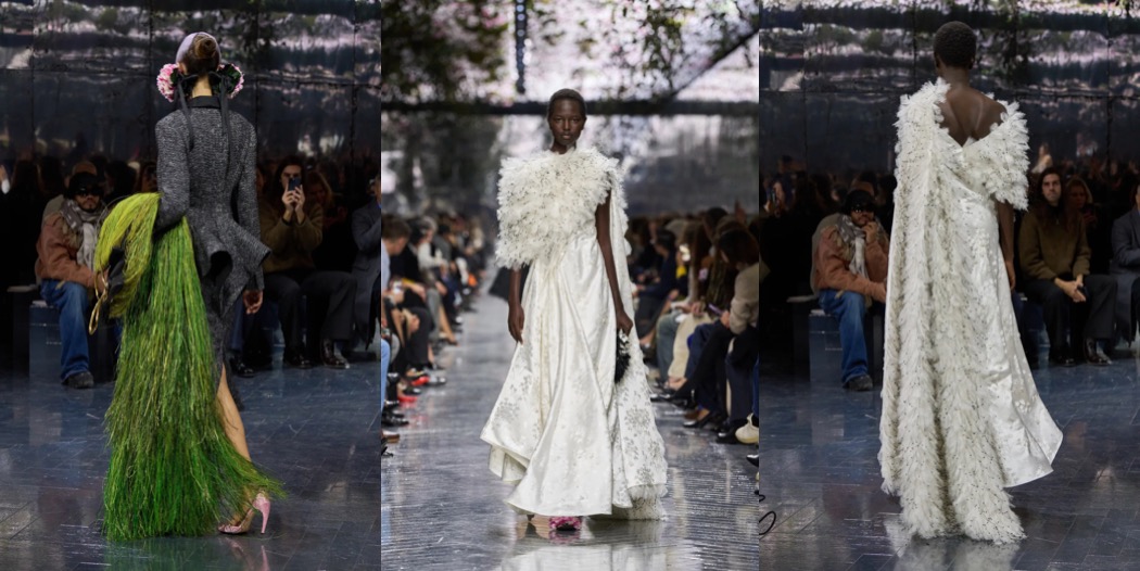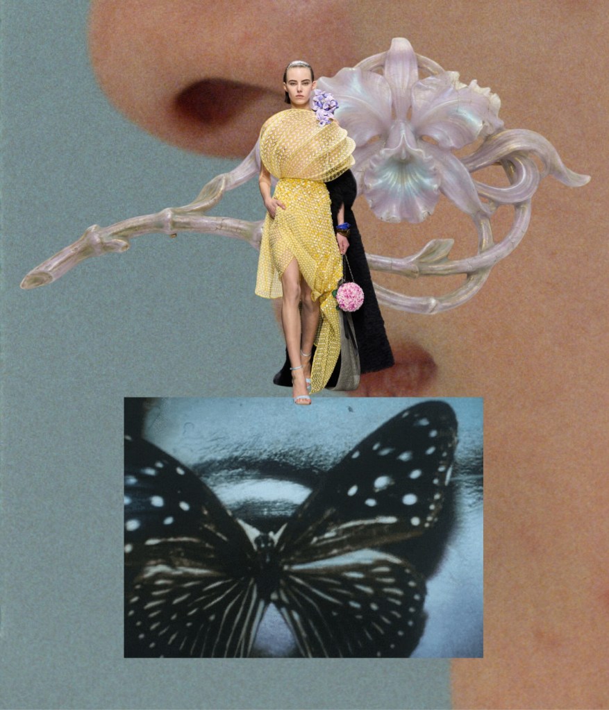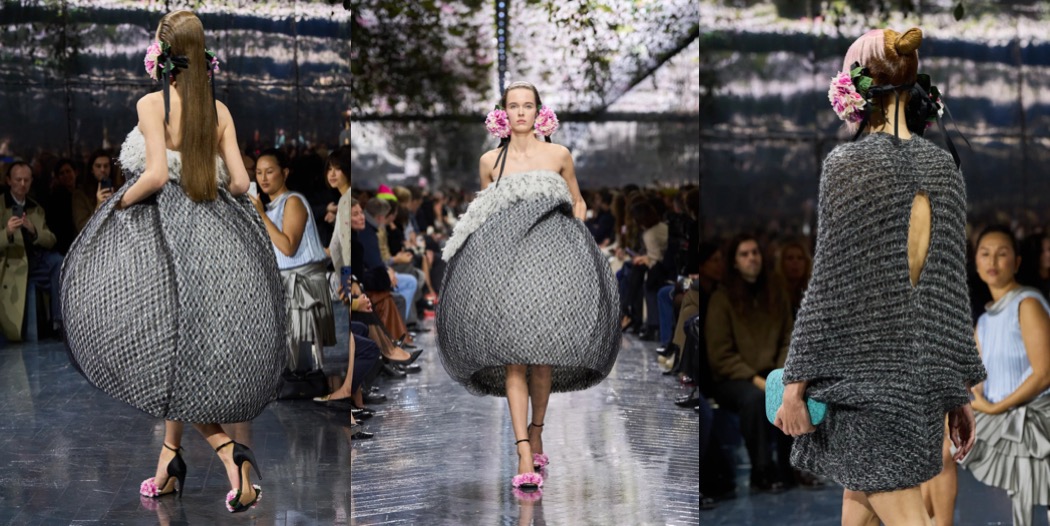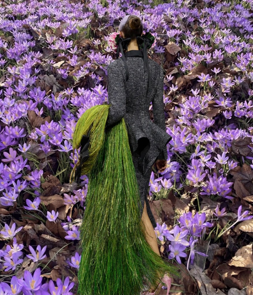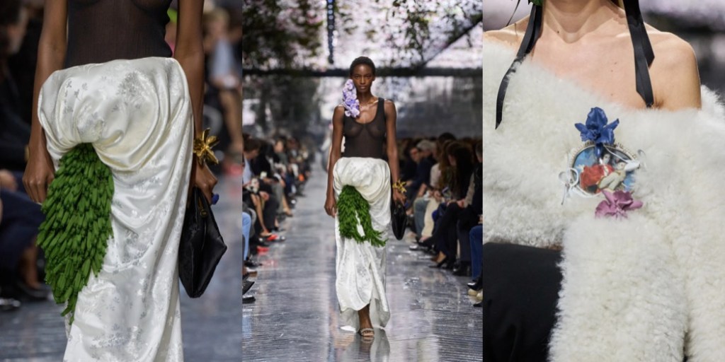 Above all, this was a couture show that exercised surrealism in the most extraordinary way, turning to the beauty of Mother Nature for inspiration. Dresses were airy like dandelions; skirts could easily be mistaken for hydrangea bushes; 18th-century-inspired portrait brooches were framed with orchids. One silk skirt in a subtle chinoiserie print appeared to explode with tiny green cones. The opening look’s bag referenced a couture hanger, yet it was entirely covered in hand-dyed, extra-long grass.
