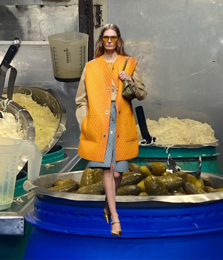 A swimming vest was reimagined as a quilted leather orange gilet, while georgette dresses with mid-calf, cinched accordion pleats moved through the air like sails in the wind. With each collection, Davis moves closer to the vision he continually strives to realize.