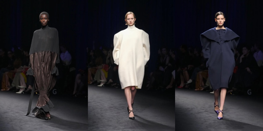 The opening segment of the collection featured handsome, oversized peacoats in navy cashmere, to which panels lined in ivory silk were buttoned in, creating a sense of Cubist deconstruction. Two Guernsey-inspired sweaters – one navy, one white – were designed with raised collars left unbuttoned to fall softly around the neck. This simple manipulation introduced a note of subtle sensuality (made me think of “Querelle“, Rainer Werner Fassbinder’s 1982 homoerotic sea-port drama).