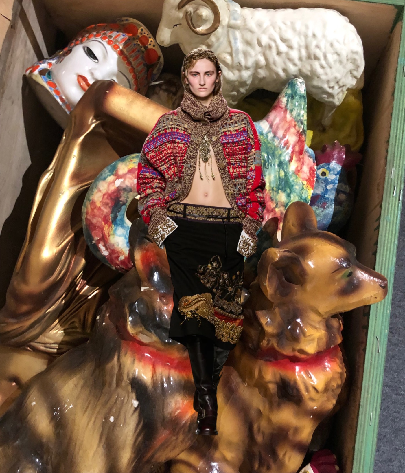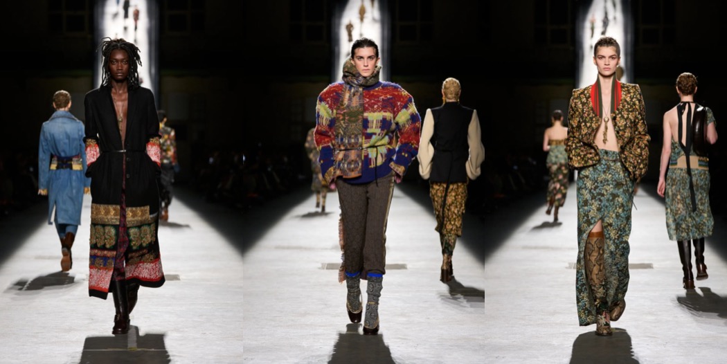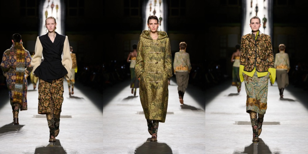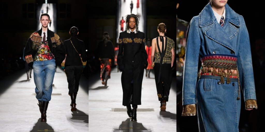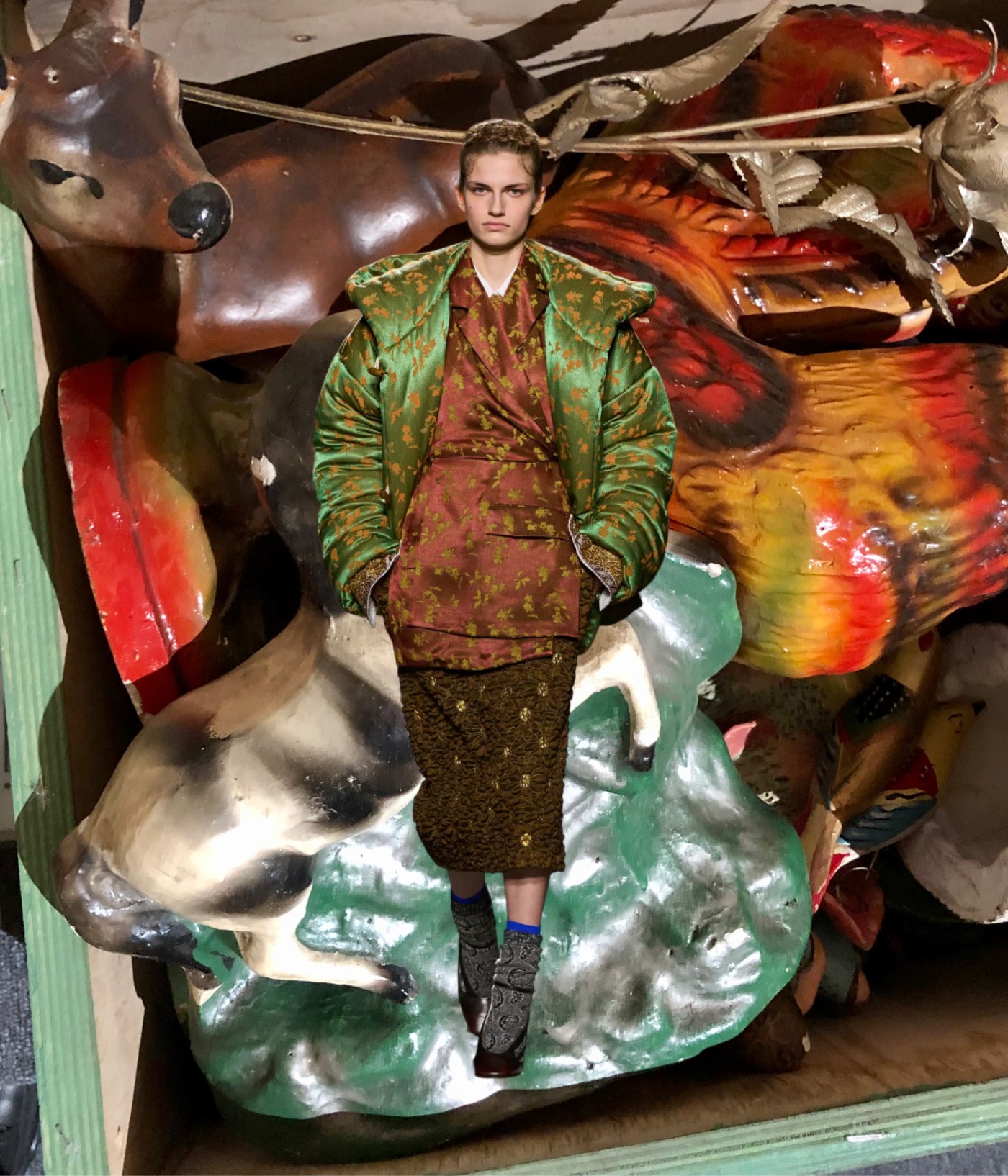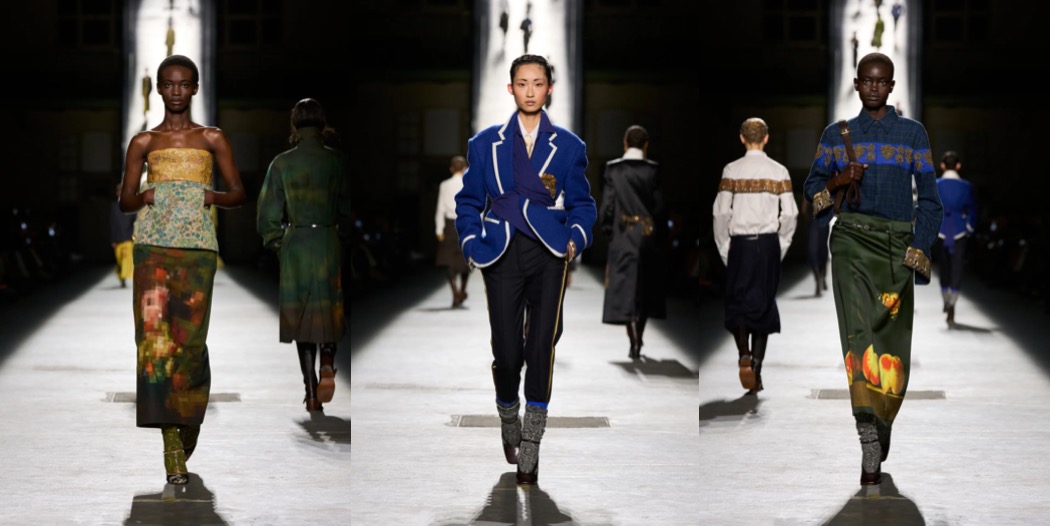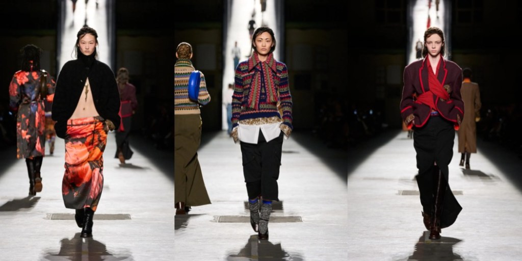 Julian Klausner’s latest collection for Dries Van Noten explored clashing styles as a means of finding one’s identity – “a moment of self-discovery.” At times, it seemed to be trying to say too much, particularly with the preppy uniforms and pixelated prints. Yet toward the end, the lineup revealed what Klausner does especially well at Dries: a kind of contemporary folklore, a patchwork of sensibilities and influences. These are clothes that roam freely between Paris, the Highlands, and Bhutan – the red mok-like wrap worn around a school jacket was a striking blend of cultures.
