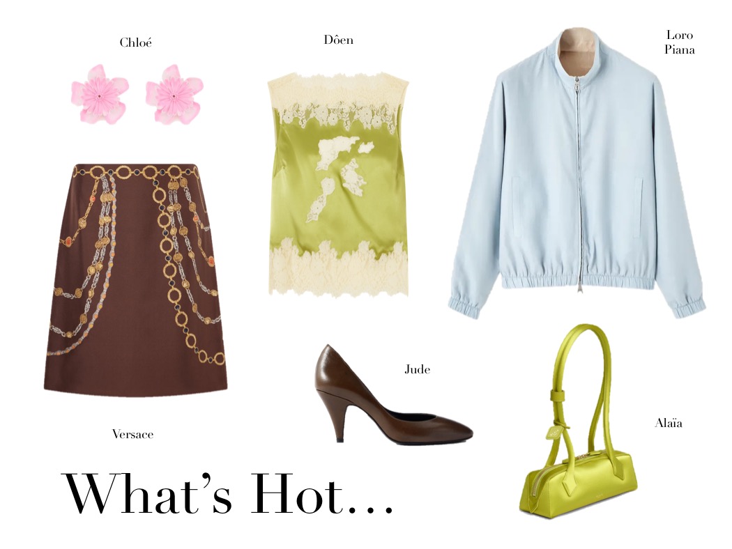 What’s Hot (24.3.26) March 24, 2026 | Design & Culture by Ed GET THE LOOK: Versace Printed Silk-twill Knee-length Skirt DÔEN Viviane Lace-trimmed Silk-satin Top Loro Piana Traveller Lady Field Jacket JUDE Haze Leather Pumps Chloé Gold-tone Resin Earrings Alaïa Le Teckel Small Leather Shoulder Bag Related