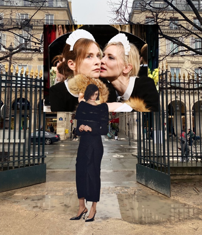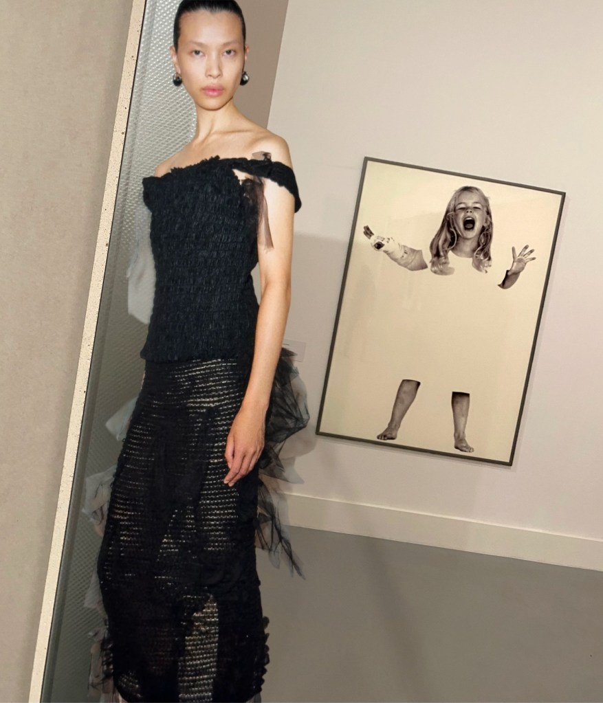 Alongside creative meditations on Mariano Fortuny’s pleats and Murano glass beads, Copping also introduced striking double-flared silhouettes, ornamented capelets, and tweed tailoring featuring a skirt pinched with a brooch. One velvet column gown in ink black is dramatically gathered by a modernist, brooch-like embellishment. This one felt absolutely Parisian, “chic ultime“.