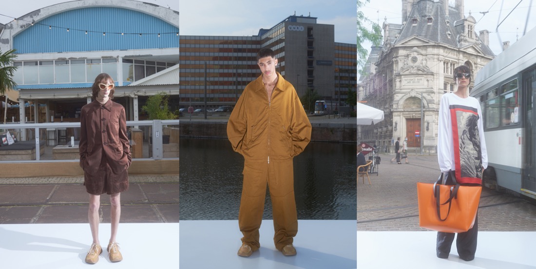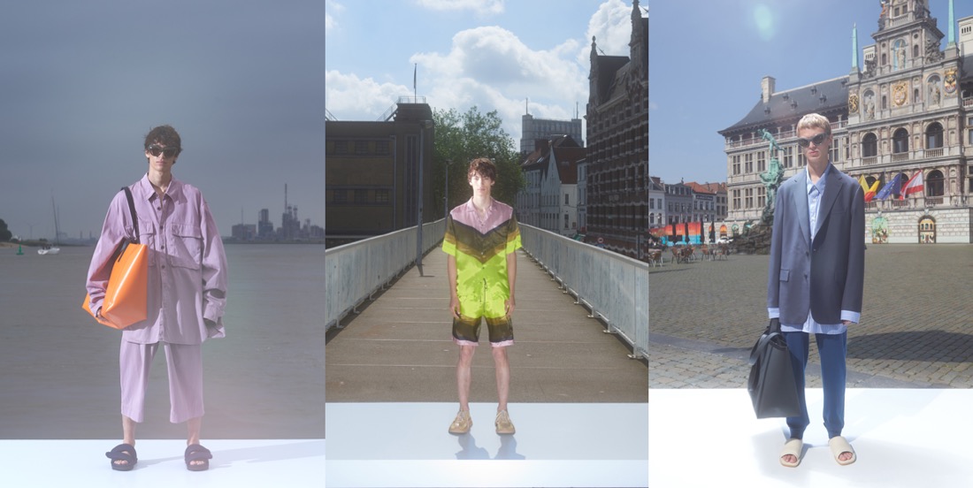 “We were in, I think, the fifth lockdown here in Antwerp when we started on this collection. And when I talked with my team to discuss what it would be about, it was really about outbursts: We’ve had it, and now we want to have fun, we want to party, we want to enjoy things, we want to go into the city and we want to see people.” So said Dries Van Noten, laying out his manifesto for a sensually hedonistic season while simultaneously echoing the Peter Fonda–sampled intro to Primal Scream’s “Loaded”, the soundtrack to the line-up’s excellent collection video: “We want to be free to do what we want to do!… And we want to get loaded! And we want to have a good time! And that’s what we’re gonna do!” Without inquiring as to whether Van Noten and his team got loaded, they clearly had a blast putting together this lovingly local, energy rush of a collection. That team made a shared folder of smartphone photos taken around the city, from industrially scenic crane landscapes to strobe-lit club shots via moody pool hall milieus, which were integrated as prints on paneled parkas and silky shirts. These images were then accented against a ’70s vintage Antwerp municipal logo and etchings taken (with permission) from two of Flanders’s most famous sons, Breughel and Rubens. The collaged images on the garments were shot against a backdrop of more city locales, to 56 of which Dries and his team dragged a white podium to make the look book. Of them all, the pink-tabarded school trip in look six proved ultimate evidence that these were not scenes just lazily projected in post. Van Noten said his attitude to this collection was: “What is menswear? What is womenswear? Just throw it all together and take what you like.” Conventional dichotomies were rendered attractively void in “womenswear” looks featuring tailored, overlong, and overdyed pants in English mohair over slides, and an awesome “menswear” camo parka and suit in 35 gram silk plongée lined in cotton voile. Geographically specific to Antwerp, but tolerantly nonspecific in terms of the geography of received gender norms, this was a collection that did indeed look great to get loaded in.