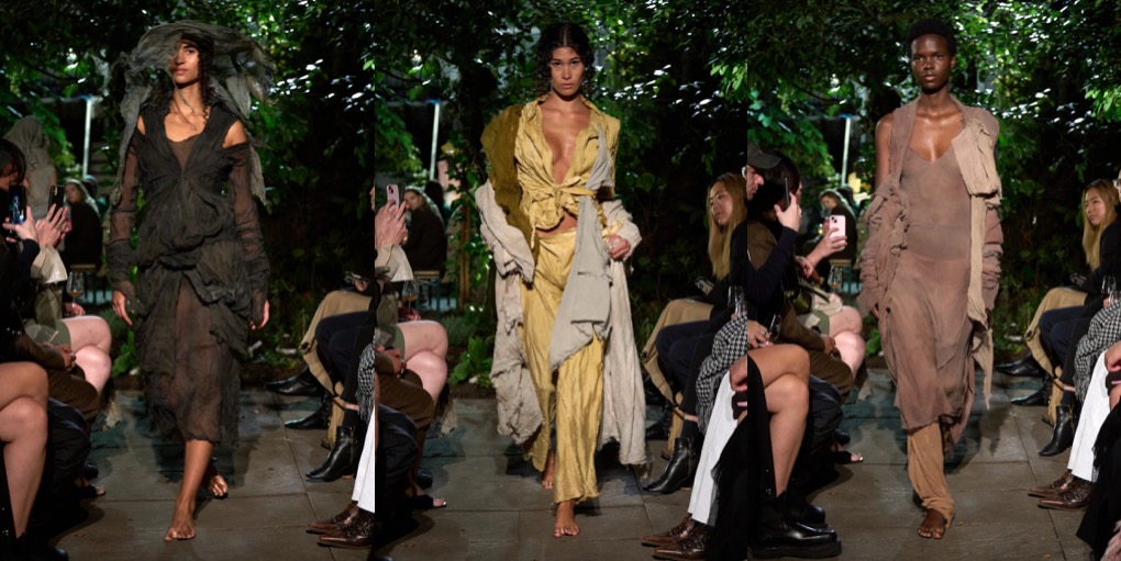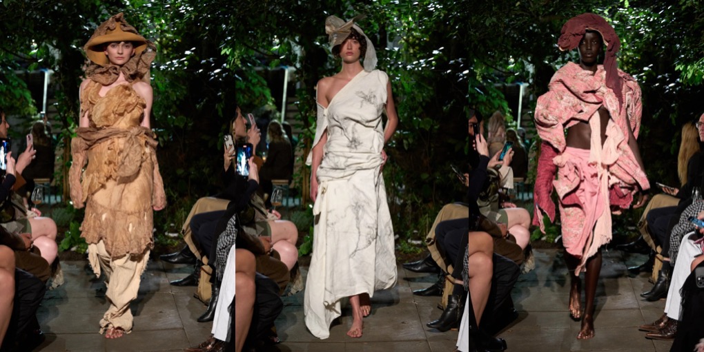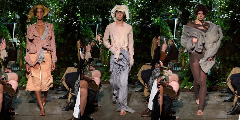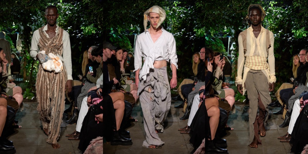 As we’re approaching 2025, everybody seems to look backwards at the last quarter of the century in fashion. But let’s also take a look at the future. Paolo Carzana, the London-based designer, makes one feel very hopeful about. The über-talented designer, a finalist for this year’s LVMH Prize, uses plants and natural pigments like burnt umber to dye his crafty, gender-fluid garments. Carzana’s signature is the raggedy, lived-in look of his garments that makes men and women look as if teleported from another century. There’s also that hazy, misty, as if seen through a broken lens, lyrical silhouette of his clothes: the pinstripes on a pair of men’s trousers look blurred, the Caravaggio-esque drapes of the dresses seem to be shaped by gushes of unexpected wind. The gauzy layering and the buttonless, zip-free poetry of Carzana’s work makes him a truly, truly unique creative who doesn’t obey the industry norms of production scaling or aggressive marketing. No other contemporary designer sees beauty and strength the way he does.