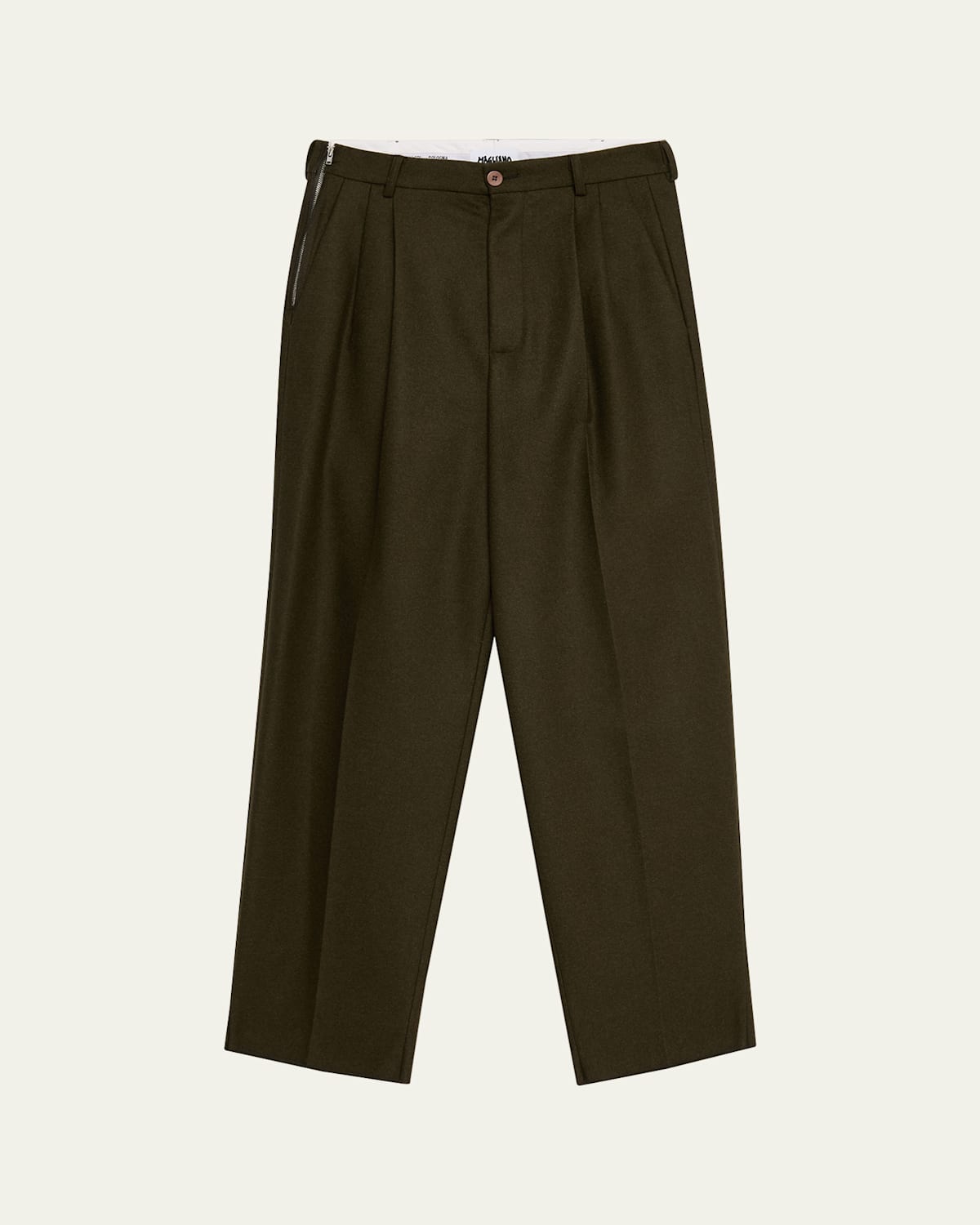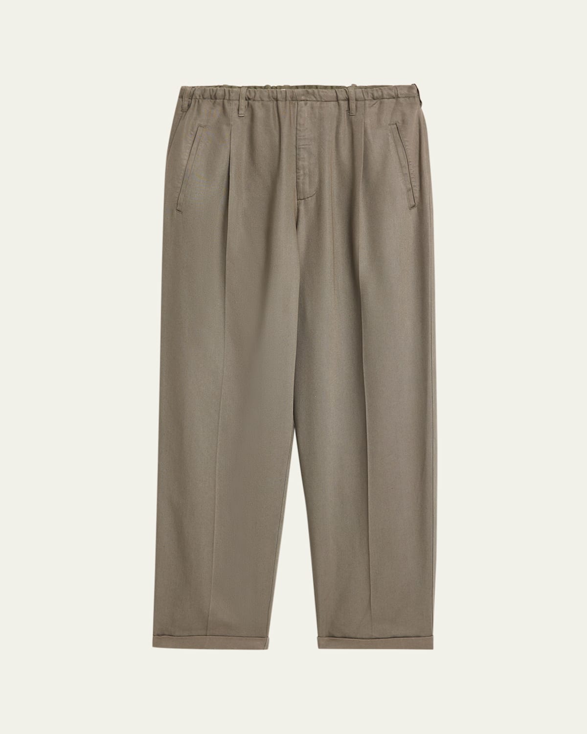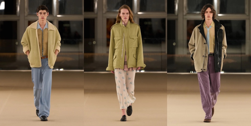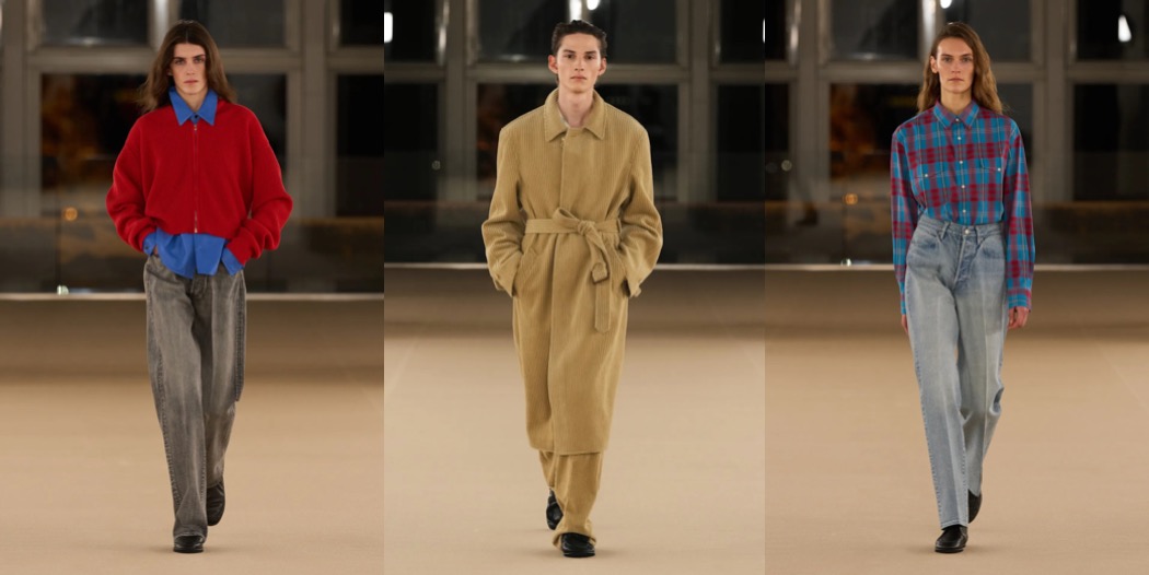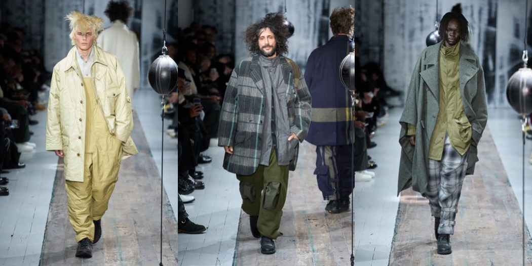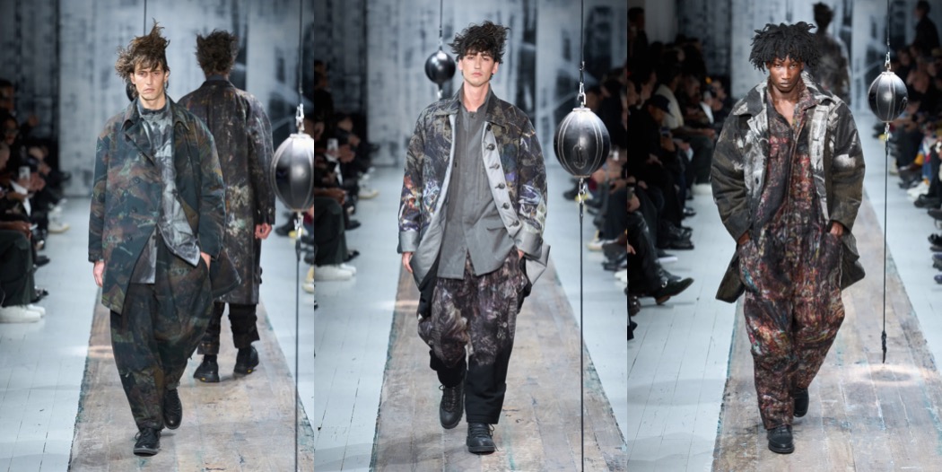 On the runway, that armor took tangible form. Yamamoto delivered one of his most colorful collections in years, though “colorful” here still meant disciplined, weighted, serious. The opening looks carried militaristic undertones: camouflage patterns coated double-breasted jackets and padded boilersuits, establishing a mood of readiness. Voluminous overcoats were paired with trousers cut from meaty corduroy and utilitarian jumpsuits in thick cotton, many printed with paint-like marks that looked less decorative than combative.