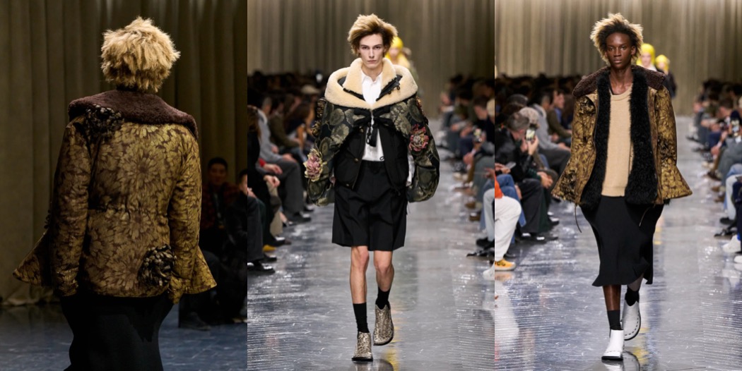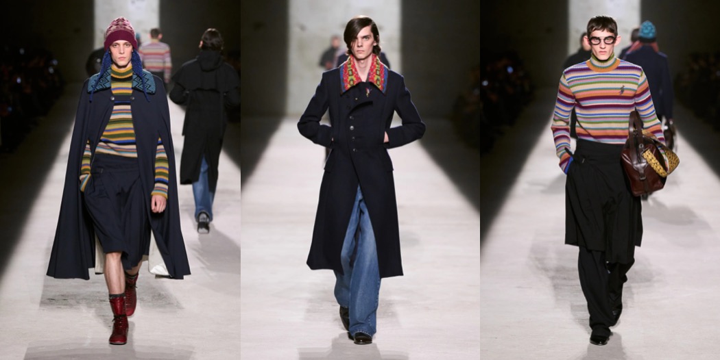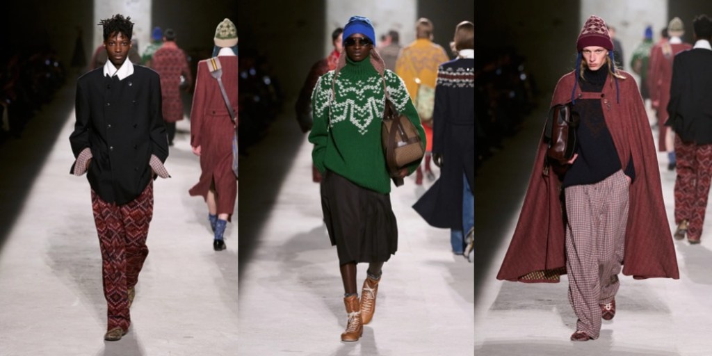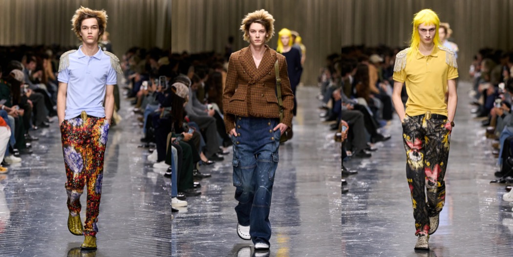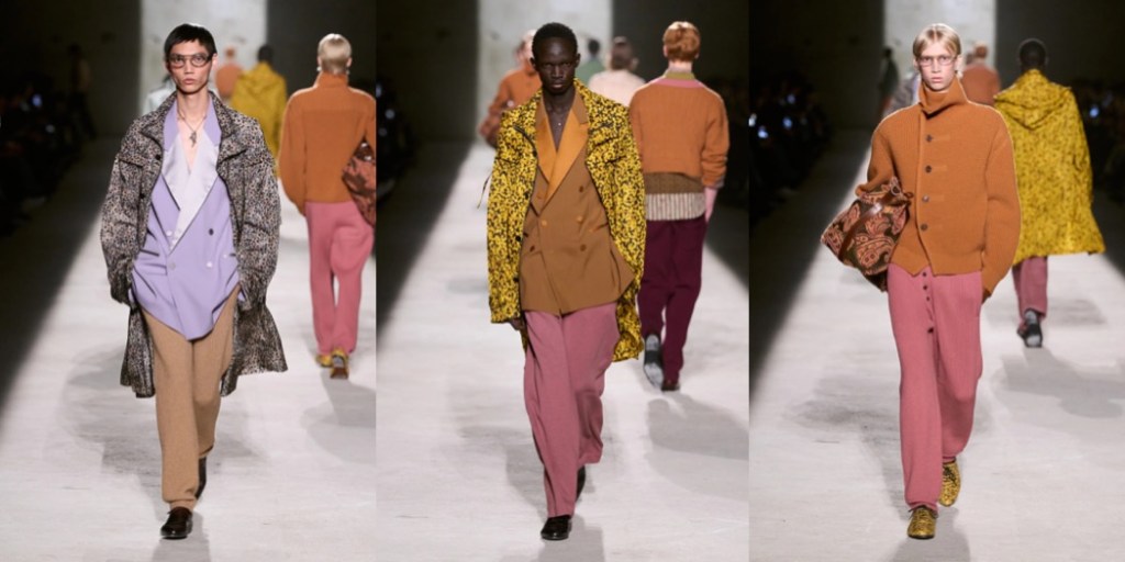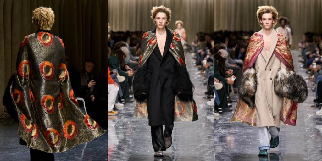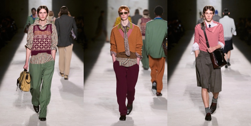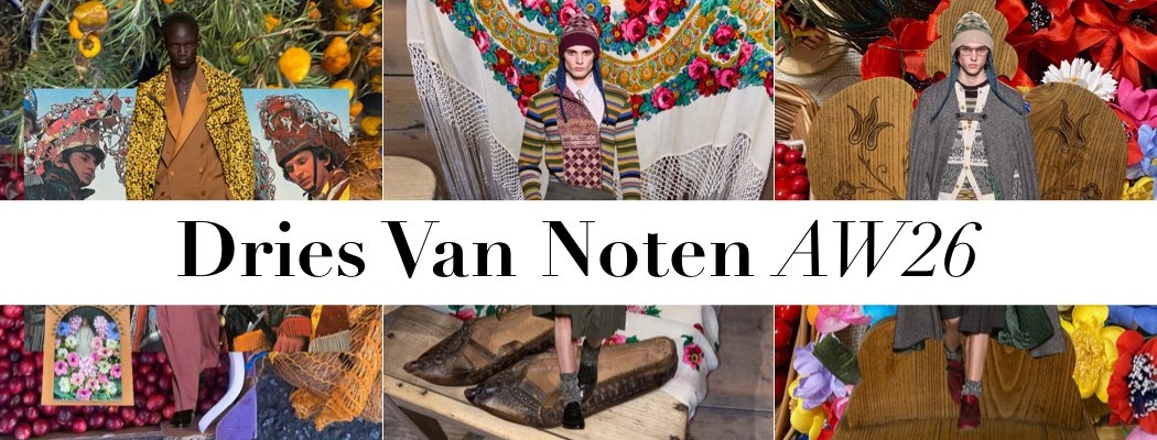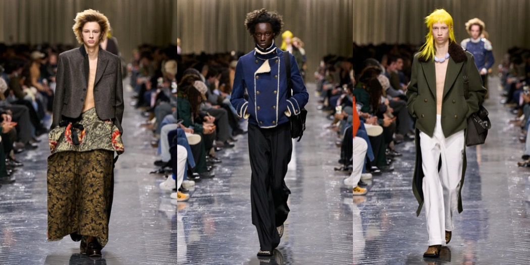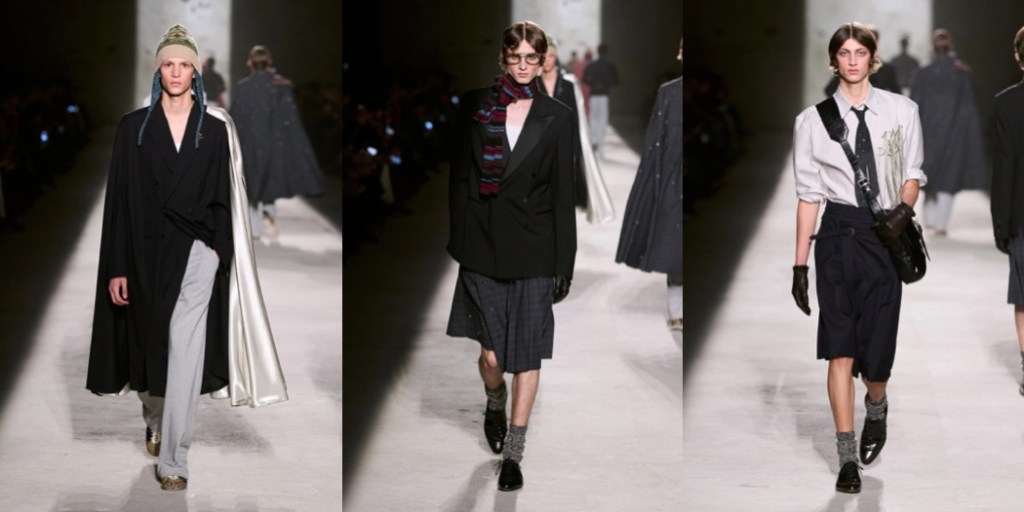 Julian Klausner delivered his strongest solo outing at Dries Van Noten to date. The autumn–winter 2026 menswear collection radiates the youthful spirit of student days, when anything seems possible: drifting from one party to the next, cramming for exams at the last minute, and handing in papers a day past the deadline. The naturally cool spontaneity of a vintage-inspired striped sweater paired with a kilt, a hilariously kooky chullo-like beanie, and lace-ups with thick socks peeking out is intoxicatingly inspiring. So, too, is the campus-inflected layering: oversized capes worn over prim, uniform-like tailoring and neatly knotted neckties.