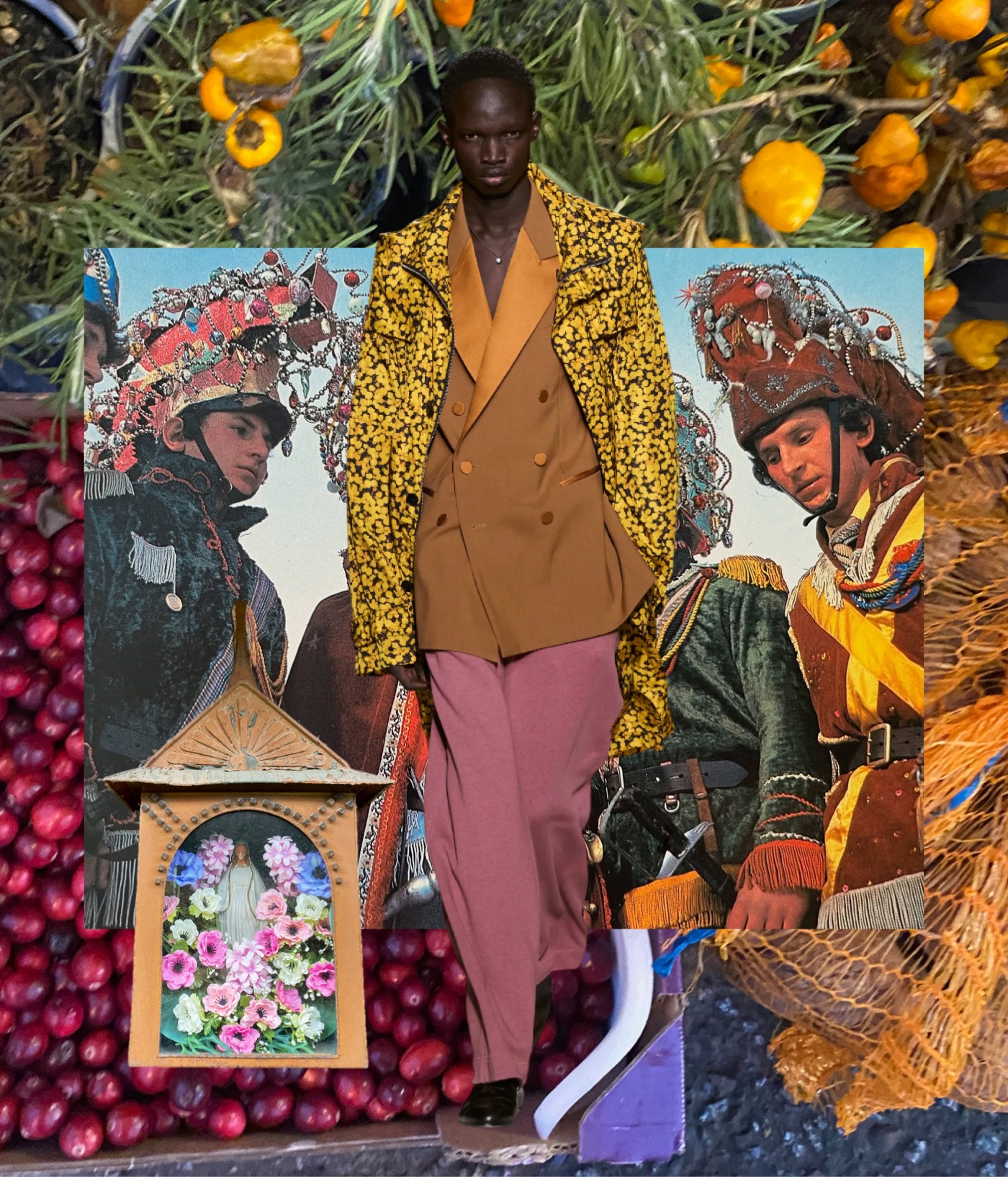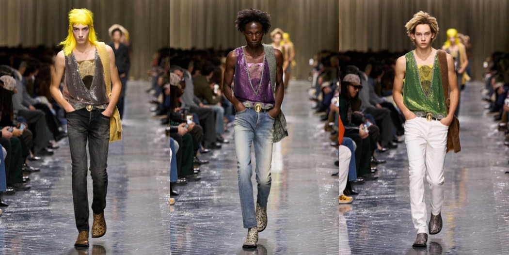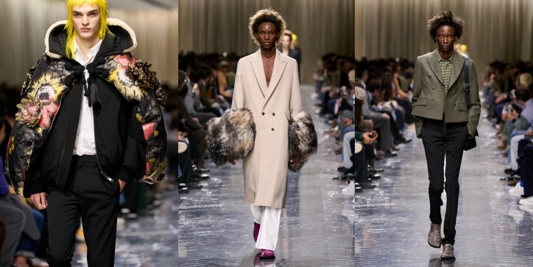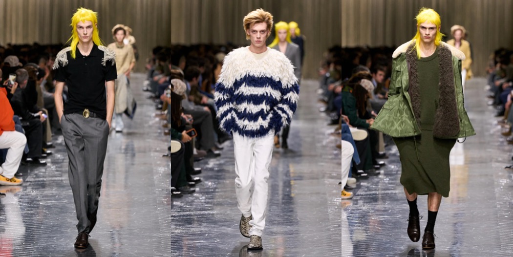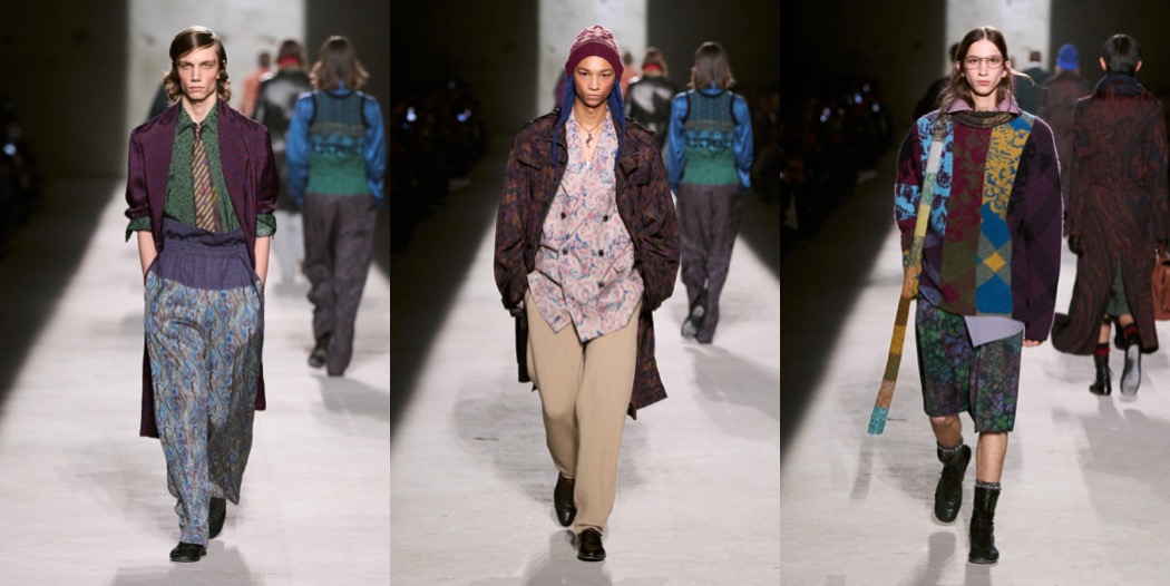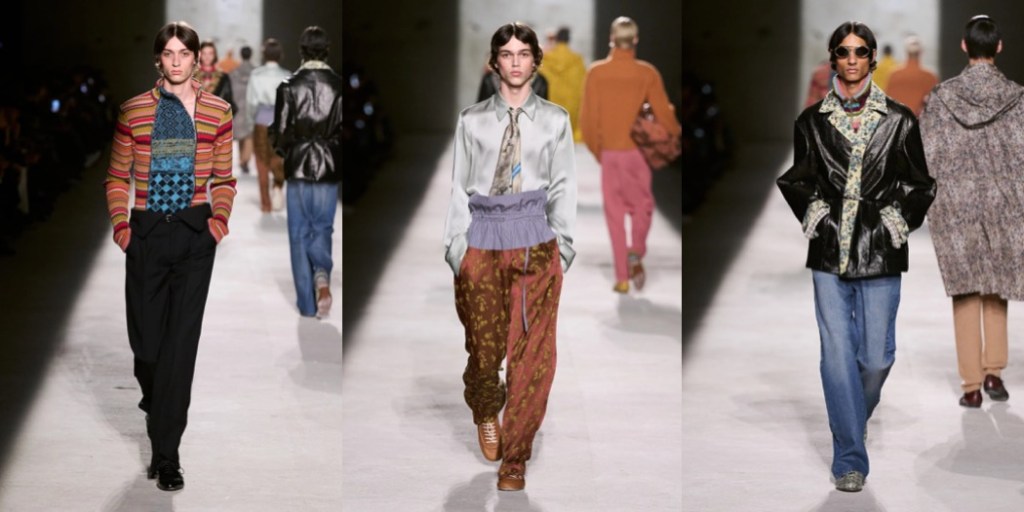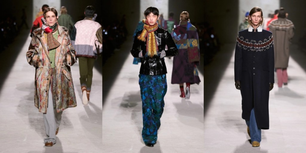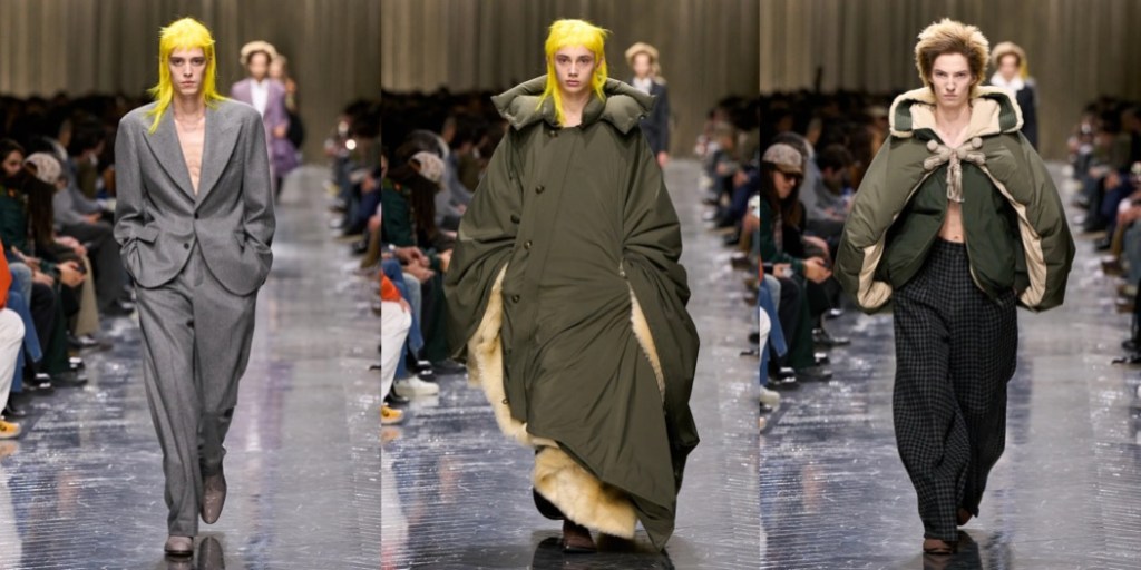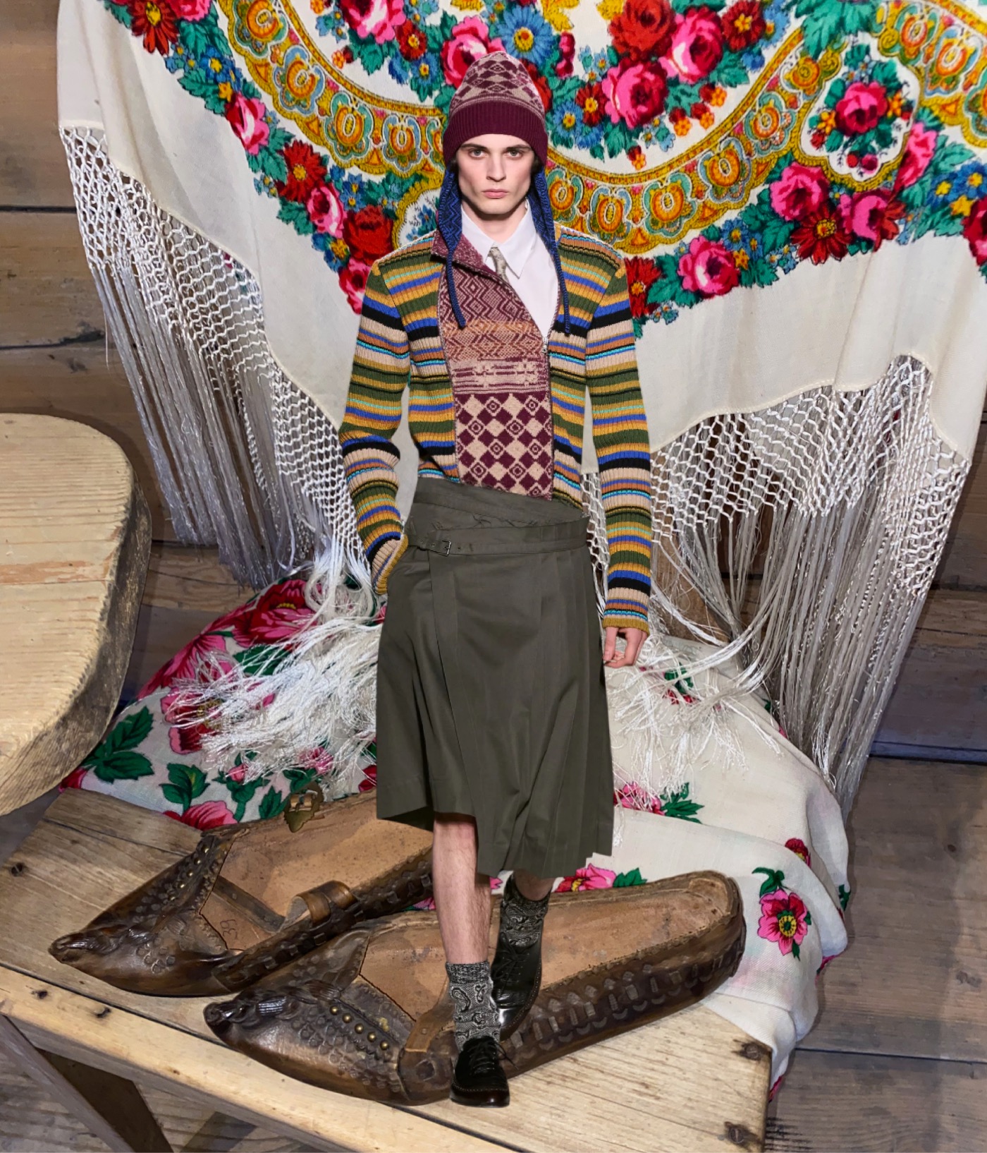 Julian Klausner delivered his strongest solo outing at Dries Van Noten to date. The autumn–winter 2026 menswear collection radiates the youthful spirit of student days, when anything seems possible: drifting from one party to the next, cramming for exams at the last minute, and handing in papers a day past the deadline. The naturally cool spontaneity of a vintage-inspired striped sweater paired with a kilt, a hilariously kooky chullo-like beanie, and lace-ups with thick socks peeking out is intoxicatingly inspiring. So, too, is the campus-inflected layering: oversized capes worn over prim, uniform-like tailoring and neatly knotted neckties.