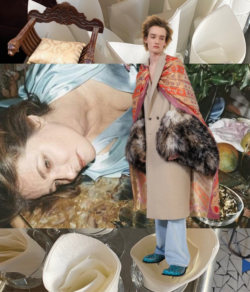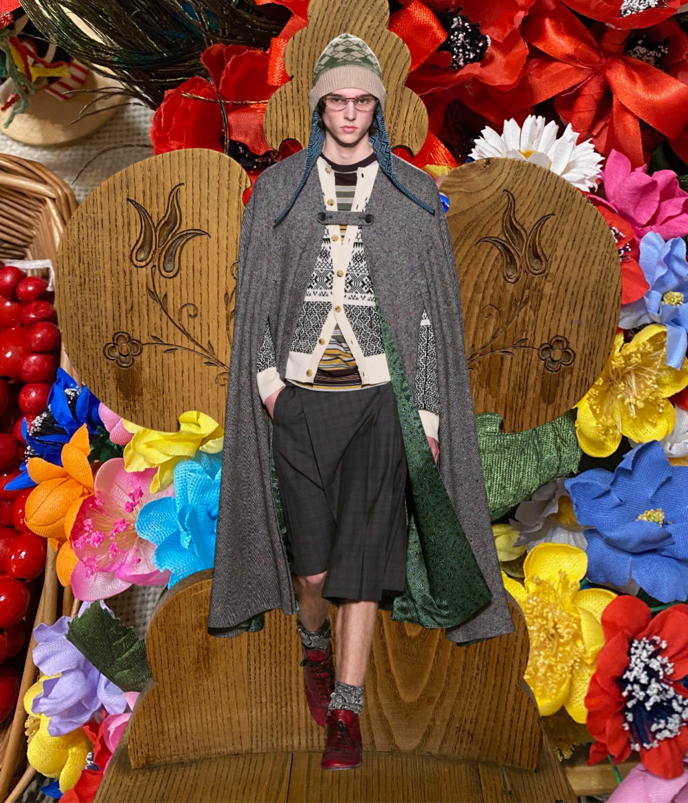 Yet this was not a collection about preppiness. I found it beautifully folkloric instead. Nordic knitwear patterns clashed with subtly faded, sensational Polaroid-like florals on satin trousers and raincoats. These are life-affirming clothes – and styling cues – that make you feel young again, no face-lift required.