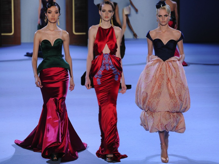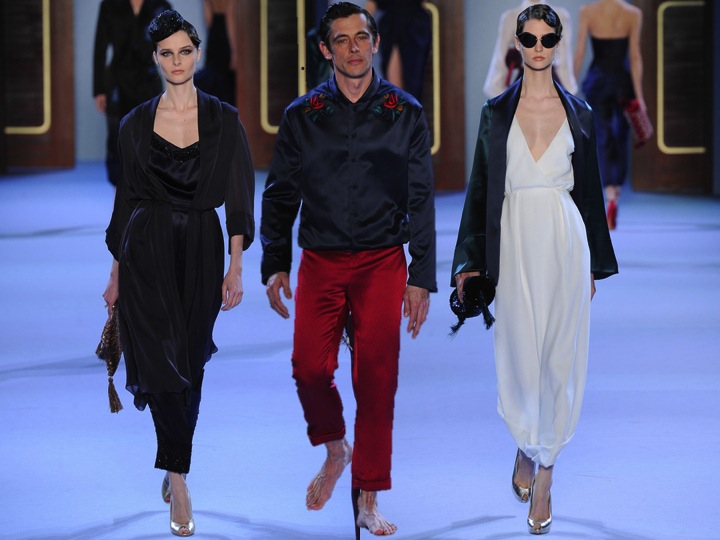 Ulyana Sergeenko, the Russian designer in Paris that thinks she will bit the world (unfortunately) already bit it up badly. The wife of a millionaire once thought, that she wants to be a fashion designer. A COUTURE designer. So her dream come true. And here is her forth collection. First of all, I don’t have anything to Kazachstan- indeed, I think their culture is beautiful just like their country. But… a collection that was inspired with traditional Kazachstan clothes and Parisian boudoir is a big mistake. Reminding cheaper looking Anna Karenina, Ulyana made her ideas come to life with a shiny collection full of hand-made Russian fabrics, ugly colours and red satin. AND THAT WEDDING CAKE GOWN. That’s too much. The model looked like a meringue! However, good news are here: male funs of Sergeenko can feel priviledged. Ulyana Sergeenko designs menswear… without footwear. If you feel brave, just have a peek how the collection looked like.