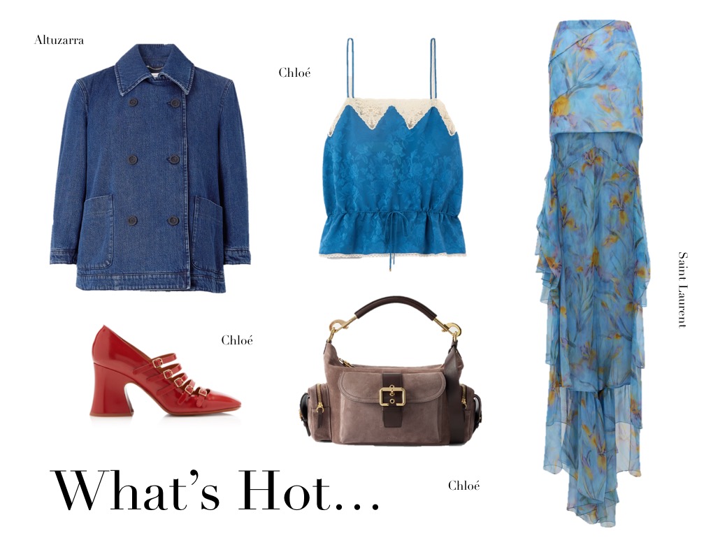 What’s Hot (20.6.25) June 20, 2025June 16, 2025 | Design & Culture by Ed GET THE LOOK: Altuzarra Hayden Double-breasted Denim Jacket Chloé Lace-Trim Floral Silk Jacquard Camisole Top Chloé Janis Patent Leather Mary Jane Pumps Chloé Camera Medium Leather-trimmed Suede Shoulder Bag TOVE Sinead Asymmetric Silk-satin And Georgette Maxi Skirt
