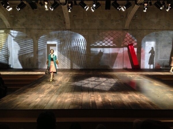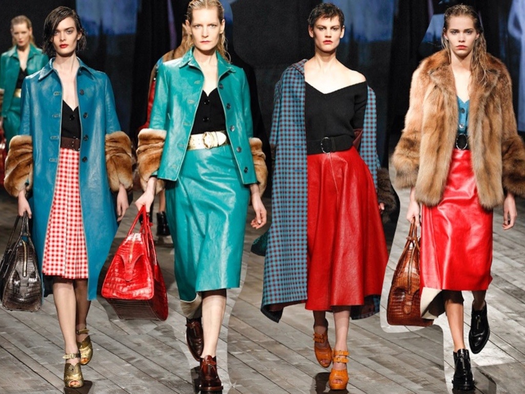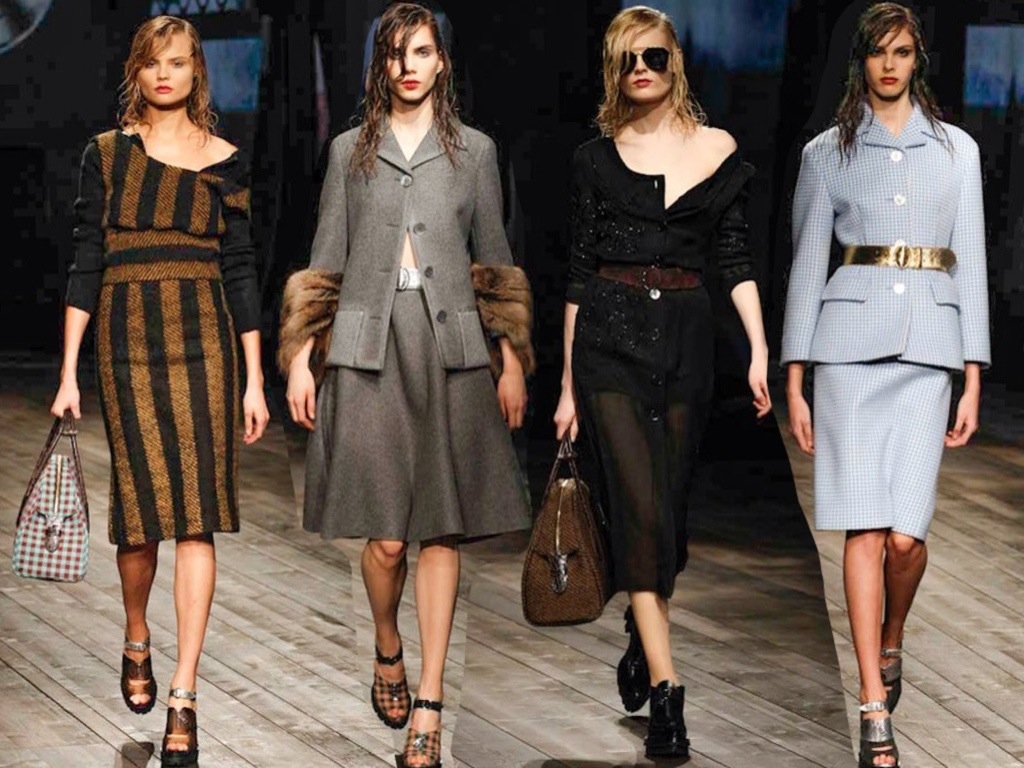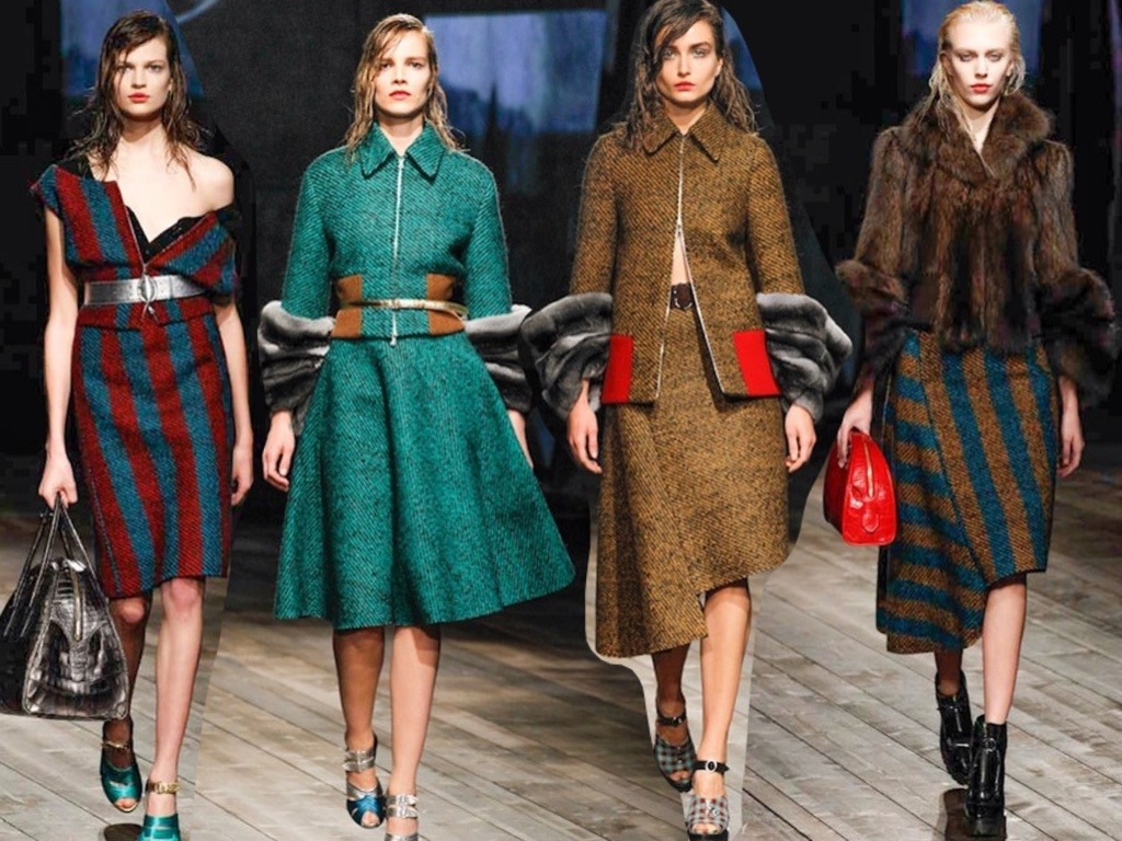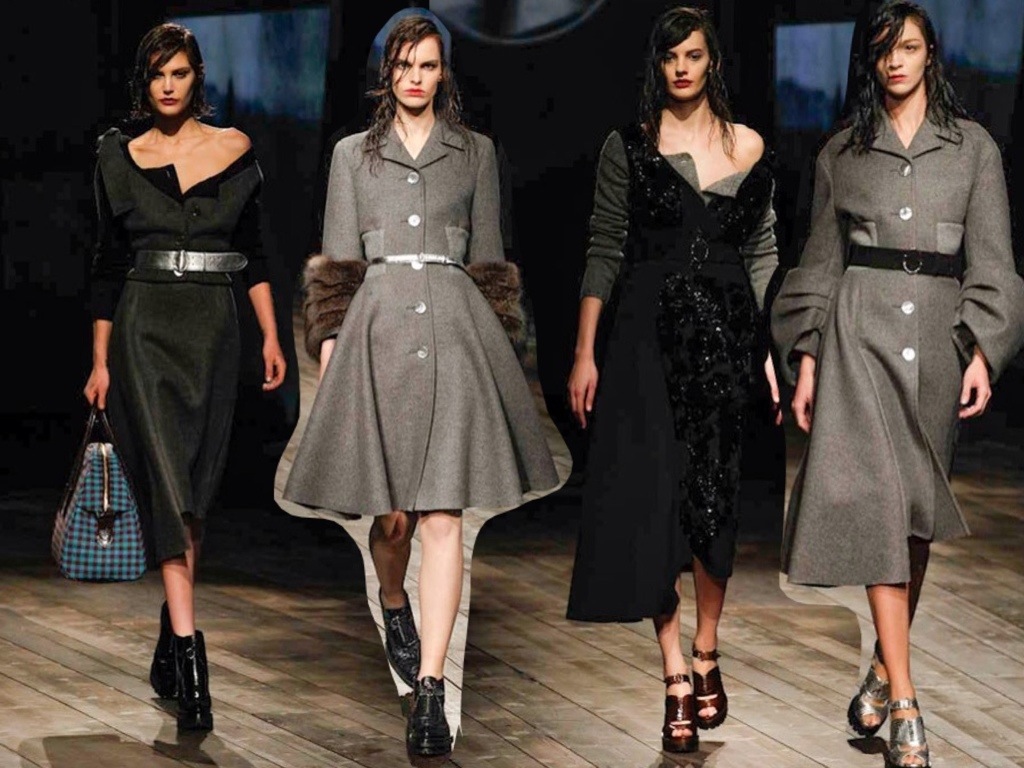 Miuccia Prada is a fashion genius. If her collections are beautiful, they are beautiful. If their are ugly, they are also beautiful! The Winter 2014 collection was the one that classified into the beautiful one! And it really was! I am always excited about Prada shows, so I saw it livestream on style.com! And I felt like if I was there. The show that had a moving film on walls, started with a black dress with a cut out triangle on shoulders that was realeated in many other colours and in metallic shades.