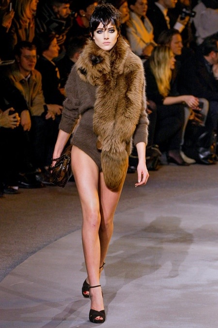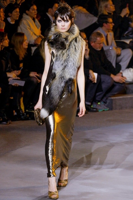 Marc Jacobs fall was a melancholic and beautiful love affair. It was inspired with The Film Noir and it was dipped like in a opium perfume. It was lady like and very sexual, delicate but with power. It was glamorous and sensual and it was totally taken out from iconic imagery of Lauren Bacall in her 1940’s finest. Luxury mink stoles, silk pajama’s like tops, pencil skirts, silky trousers, clingy knits, overcoats and wide lapels and T Strap heels (that are toatally in fashion this season) were presented.