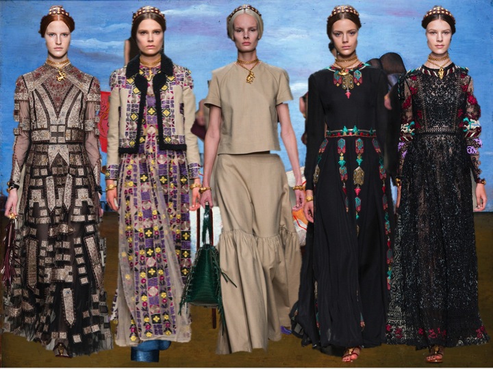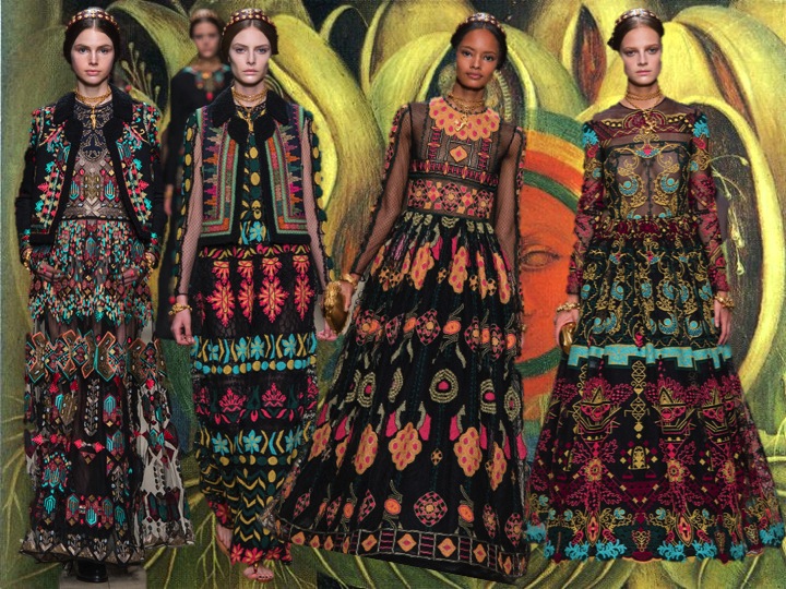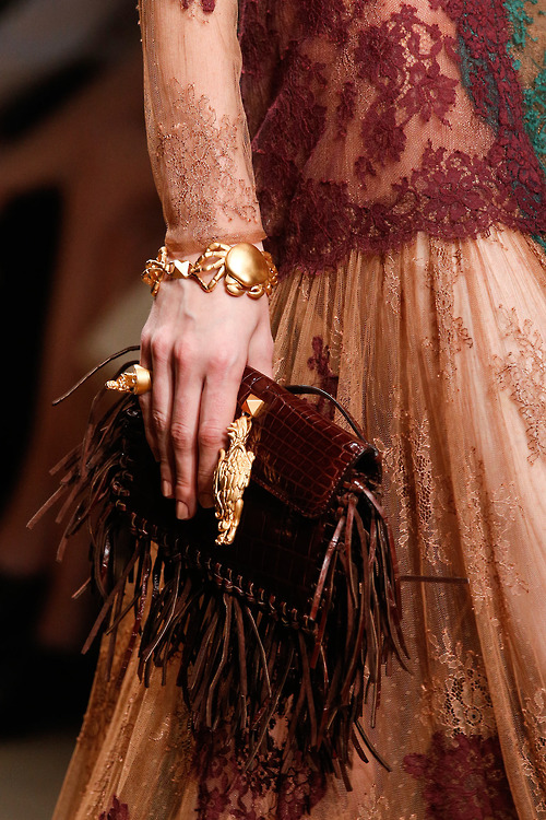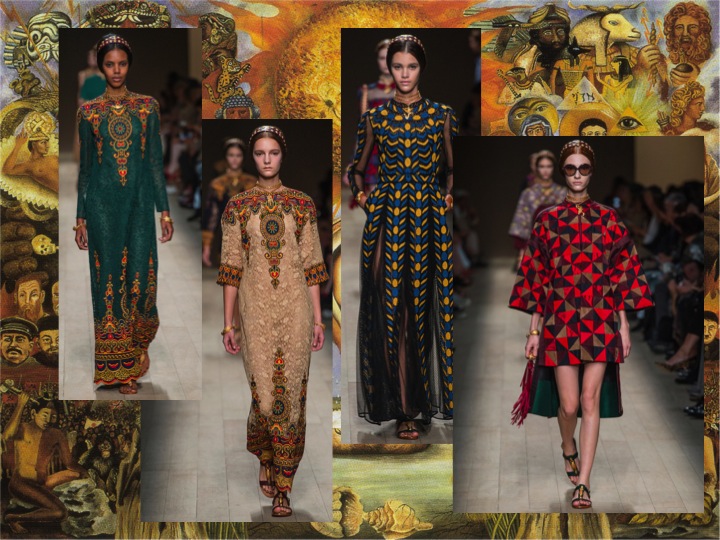 Valentino was definitely one of the most beautiful collections of the season. With the SS14’s tribal influence, Valentino took us to South America, where Aztecs and Mayas decorated their temples in opulent and splendour way. The craftsmanship of the collection is impressive- all the couture embroideries on dresses looked like if were made by one of the local Mexican women, dying and threading each flower and shape into silk. There were also some inspirations with Latin explorer-chic- suede capes with frenzies, sandals, jewellery with zodiac amazing use of denim with Guatemalan skirts and tops. However, there was something about sexy 70’s of Hollywood and Byzantine luxury hidden in the looks- crowns, rich colours, sensual lace, ribboned shirts… Valentino not only took as into the beautiful journey to South America and it’s secrets, but also made it in surrounded with European qualities and chic!
