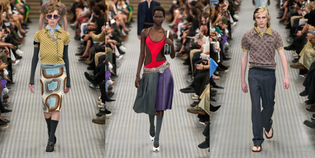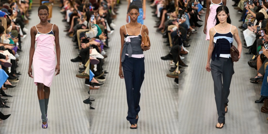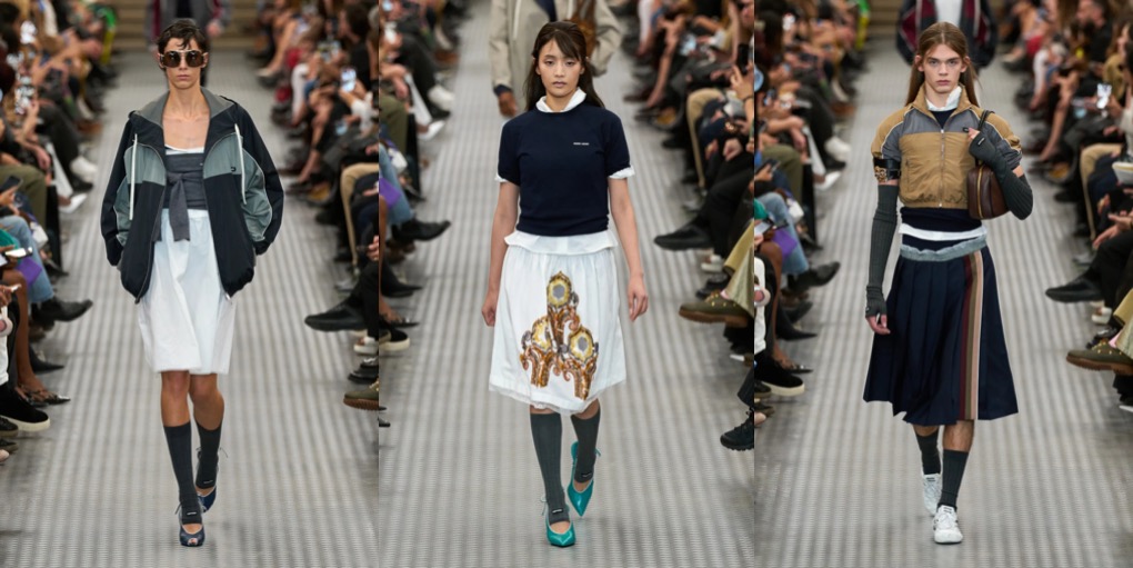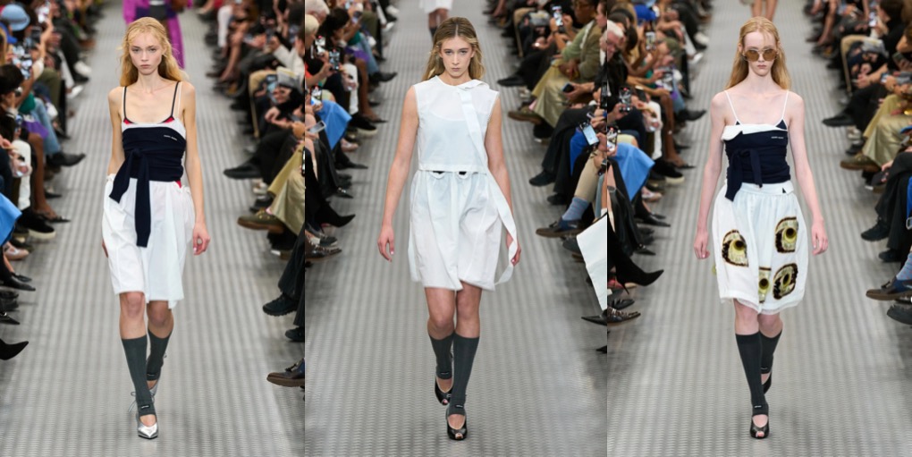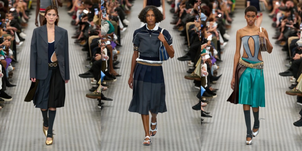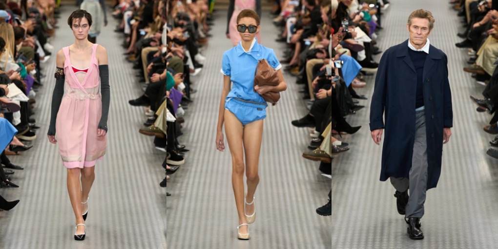Miu Miu‘s spring-summer 2025 collection was a post-post-modern collage of various notions of femininity, seen through the lens of Miuccia Prada‘s absolutely distinct Miu-isms. This girl was certainly interrupted – the Miuccia way, with styling help of Lotta Volkova. To start, there were underthings worn as outer things, such as white cotton slips; some had graphic sequined embroideries. Sporty track separates and cutout bathing suits were also in the mix, along with private-school uniforms 1970s-ish geometric prints lifted from a spring 2005 collection (that’s the thing about Prada: 20 years later, her concepts feel like new). It was a wild juxtaposition of things that don’t belong together yet somehow work together. Western belts and waitress dresses, well-worn shirting and sporty bikini tops… but in the end, there was method to this chaos. And then you had Willem Dafoe closing the show.