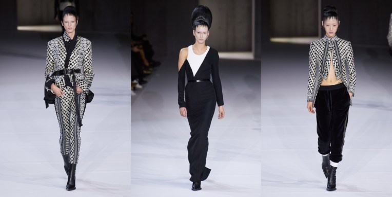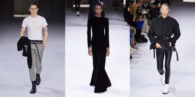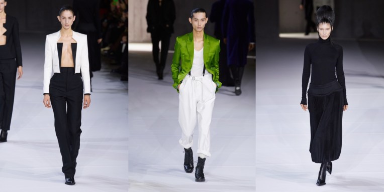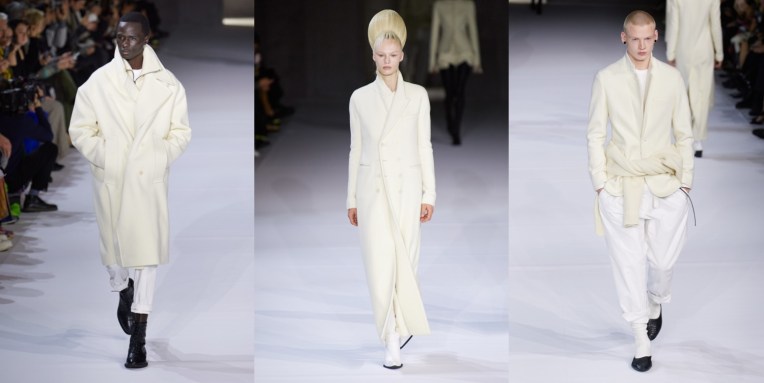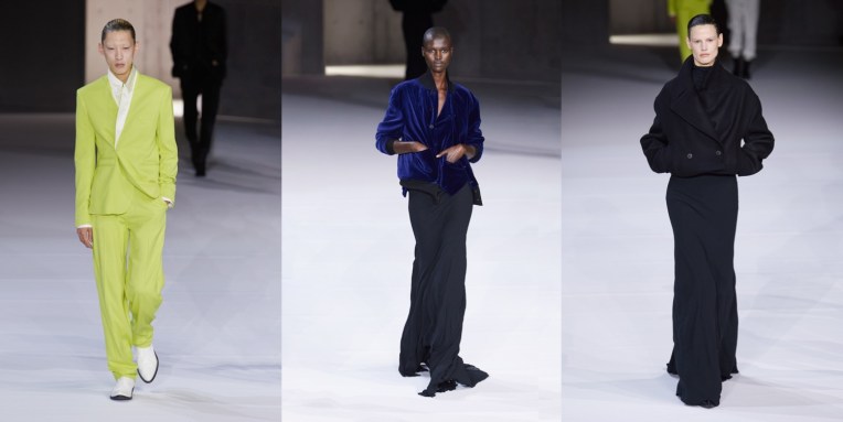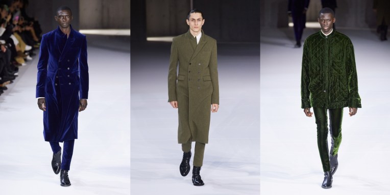 Timothée Chalamet attended Haider Ackermann‘s autumn-winter 2020, but that of course wasn’t the sole highlight of the entire event. Although there was no real explanation regarding the line-up (“I don’t like to define,” said the designer), the keys to unlocking the thought behind the collection appeared to reside in the track list upon the cotton quilt coat in one of the men’s looks. Under Ackermann’s signature and the headline “Private Dancer” was a list of songs, including Leonard Cohen’s “I’m Your Man,” David Bowie’s “Absolute Beginners,” Yoko Ono’s “I Want My Love to Rest Tonight,” Underworld’s “Born Slippy,” Eminem’s “Lose Yourself,” and Dolly Parton’s “Jolene”. “These are all my favorite songs,” Haider told the press. “It was just an ode to everything I love.” The collection was also a mix that unfolded in groups of looks for both women (sometimes under space-age beehive hats that elevated the silhouettes even more) and men. From wearing shades of ecru to rich velvets to black, the models walked in packs. What united them was the Ackermann eye for the romantic, the poetic and the sensual. At the back of jackets, vents bled into extra folds of material that caressed the silhouette. Long and lean overcoats were contoured with collars and buttons in a series of masterfully produced arrangements. This show was a painstakingly tailored mixtape of all of Ackermann’s wearable passions and signatures. Simply speaking: beautiful.