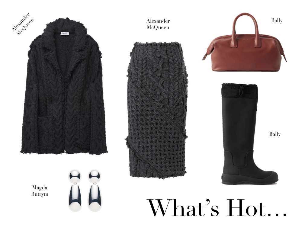 What’s Hot (4.8.24) August 4, 2024August 2, 2024 | Design & Culture by Ed Alexander McQueen Distressed Embellished Cable-knit Wool-blend Cardigan Alexander McQueen Frayed Cable-knit Wool-blend Midi Skirt Bally Belle Small Leather Tote Bally Clover Twill-trimmed Coated-leather Knee Boots Magda Butrym Silver-tone Earrings