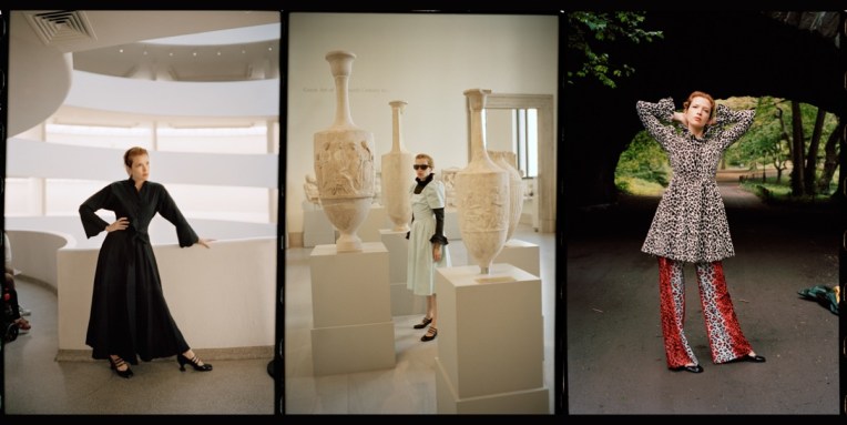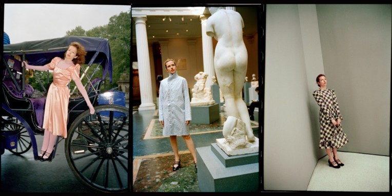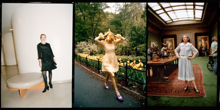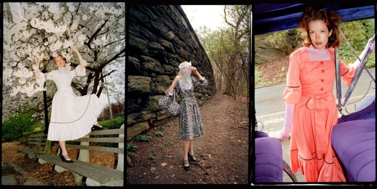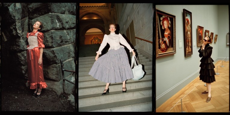 Batsheva‘s resort 2022 is a love letter to New Yorkers, all of it photographed on and worn by the beautiful locals. With her photographer husband, Alexei Hay, she set up a booth in Washington Square Park and recruited people in the area to change into her spring offering and model it spontaneously. One went full Dovima in a strapless ’50s-style golden gown and kitten heels. Another just tossed an ivory dress coat over their regular clothes, coffee cup in hand. There are teen goths, lovers, sisters, NYU graduates, and passersby smiling throughout the look book, a total celebration of New York back in action. The breadth of this season’s offering is as diverse as the people in the clothes: a skateboarder wears a roomy midi-housedress in a hologram print. Best friends sport a shapeless glittery dress inspired by a traditional Hasidic style and burnout velvet pants. A roller skater chose practical black-and-white ruffles while a pair of sisters model crochet tops and skirts. This is probably as close as we’ll get to “probably back to normal” this summer – and it looks great. And what’s new in the designer’s gradually-evolving dictionary? On a basic level, school clothes make sense as an inspiration for Batsheva Hay – and not just for their sweetness. She started her brand as a young mother, aiming to make funny dresses that work for working moms. Now her daughter, Ruth, is well into elementary school with a uniform of a pinafore, shirt, and cardigan. Hay has sized up each of these to an adult scale and rendered them in shades of neon yellow, brown, and cherry red, adding rosettes to the boxy sweaters.