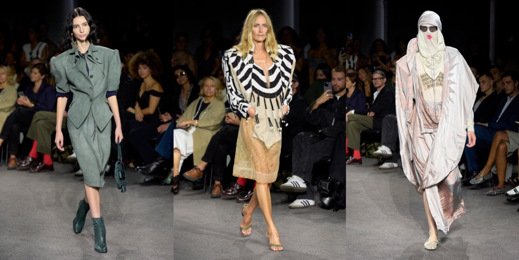 The collection blended Kronthaler’s affection for fluid silhouettes and Milano’s sartorial heritage. Tailoring was slouchy and nonchalant, but utterly chic. The coats were broad-shouldered or leopard-printed, and full of Milanese charisma. Hunky men in dresses and killer-high platforms were an exuberant view – especially when seen in a passeggiata through a San Babila café and then out on street side marble-floor arcade. A rose-embroidered tabard with a mid-calf red satin boot was a look that was both ecclesiastical in its clerical regality and campy in its unabashed queerness.