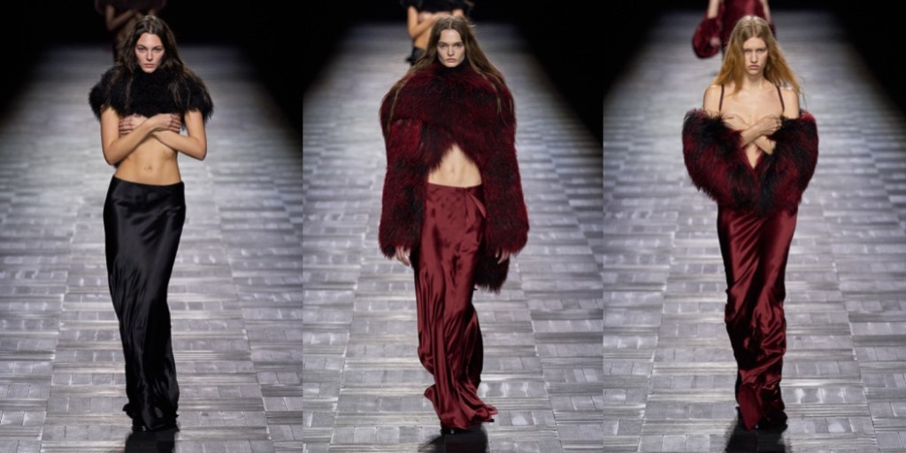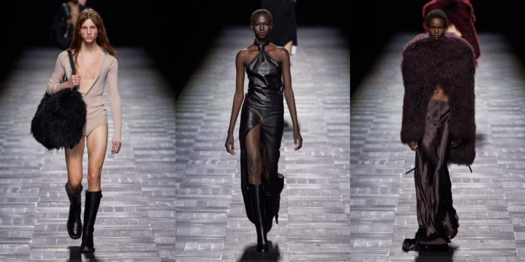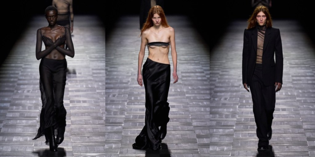 Ludovic De Saint Sernin as the creative director at Ann Demeulemeester: this sentence still surprises. The Antwerp-based brand – and its founder – affiliate with a certain depth, as evocative and raw as Patti Smith’s poetry and music; it’s about a humble crisp white shirt so well-tailored it will serve you for years; her brand used to be the epitome of sensuality that was mysterious, fluid and in a way ephemeral, blink-and-you-will-miss-it. Ludovic De Saint Sernin, meanwhile, judging on his Parisian namesake label of hyper-sexualizing clothing, isn’t really about those elusive notions. His debut collection for the Belgian house seemed to check all the boxes of the preconceived image Demeulemeester has in the mind of general public: long floor-sweeping lenghts, boy-ish black suits, a dark colour palette with drops of maroon. What certainly felt like an ambiguous idea was De Saint Sernin’s choice of covering female models’ breasts. With an exaggerately big feather (another Demeulemeester code), with a shearling capelet, or with hands. The brand’s founder, who through clothes celebrated women’s liberation and their bodies, would never censor her models. Probably, De Saint Sernin’s idea sprang from Instagram’s and TikTok’s disturbing, AI-generated anti-nipple policy (being applied to women only – because men’s nipples appear to be absolutely acceptable, and ironically, De Saint Sernin didn’t cover them in his menswear looks…), which is a topic for a whole another post. And here’s the problem: Ann Demeulemeester, the designer, wouldn’t seek approval from such thing as Instagram, while Ludovic De Saint Sernin’s vision of sexuality is conceived for that specific platform. The autumn-winter 2023 clothes weren’t bad – they might even sell well – but they weren’t an innovative take on Demeulemeester’s design legacy. Except for a couple of Ludovic-look-a-like models (this designer has a certain level of heavy narcissism about him), you wouldn’t be able to distinguish this line-up from what the brand had in offer for the past couple of studio-designed seasons.
