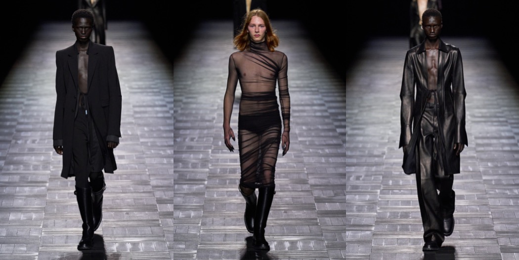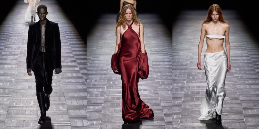 Ludovic De Saint Sernin as the creative director at Ann Demeulemeester: this sentence still surprises. The Antwerp-based brand – and its founder – affiliate with a certain depth, as evocative and raw as Patti Smith’s poetry and music; it’s about a humble crisp white shirt so well-tailored it will serve you for years; her brand used to be the epitome of sensuality that was mysterious, fluid and in a way ephemeral, blink-and-you-will-miss-it. Ludovic De Saint Sernin, meanwhile, judging on his Parisian namesake label of hyper-sexualizing clothing, isn’t really about those elusive notions. His debut collection for the Belgian house seemed to check all the boxes of the preconceived image Demeulemeester has in the mind of general public: long floor-sweeping lenghts, boy-ish black suits, a dark colour palette with drops of maroon. What certainly felt like an ambiguous idea was De Saint Sernin’s choice of covering female models’ breasts. With an exaggerately big feather (another Demeulemeester code), with a shearling capelet, or with hands. The brand’s founder, who through clothes celebrated women’s liberation and their bodies, would never censor her models. Probably, De Saint Sernin’s idea sprang from Instagram’s and TikTok’s disturbing, AI-generated anti-nipple policy (being applied to women only – because men’s nipples appear to be absolutely acceptable, and ironically, De Saint Sernin didn’t cover them in his menswear looks…), which is a topic for a whole another post. And here’s the problem: Ann Demeulemeester, the designer, wouldn’t seek approval from such thing as Instagram, while Ludovic De Saint Sernin’s vision of sexuality is conceived for that specific platform. The autumn-winter 2023 clothes weren’t bad – they might even sell well – but they weren’t an innovative take on Demeulemeester’s design legacy. Except for a couple of Ludovic-look-a-like models (this designer has a certain level of heavy narcissism about him), you wouldn’t be able to distinguish this line-up from what the brand had in offer for the past couple of studio-designed seasons.