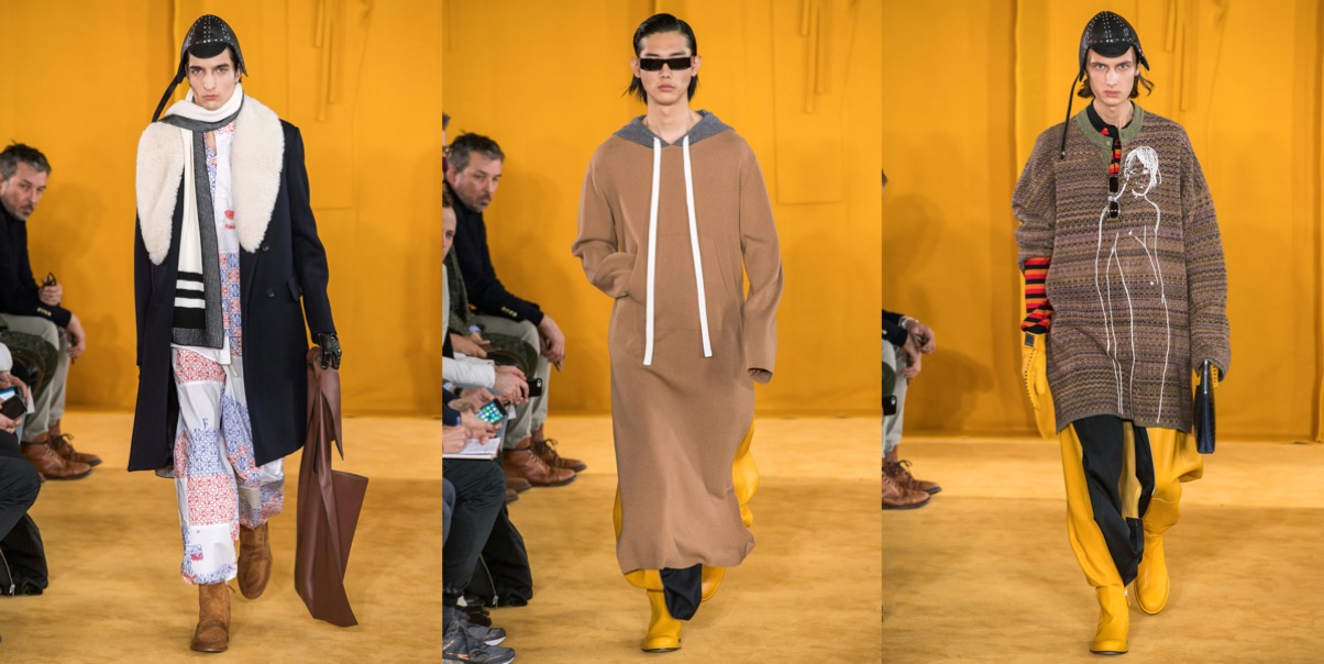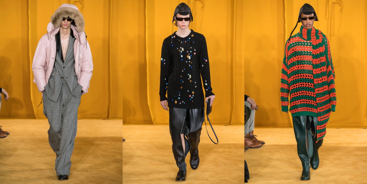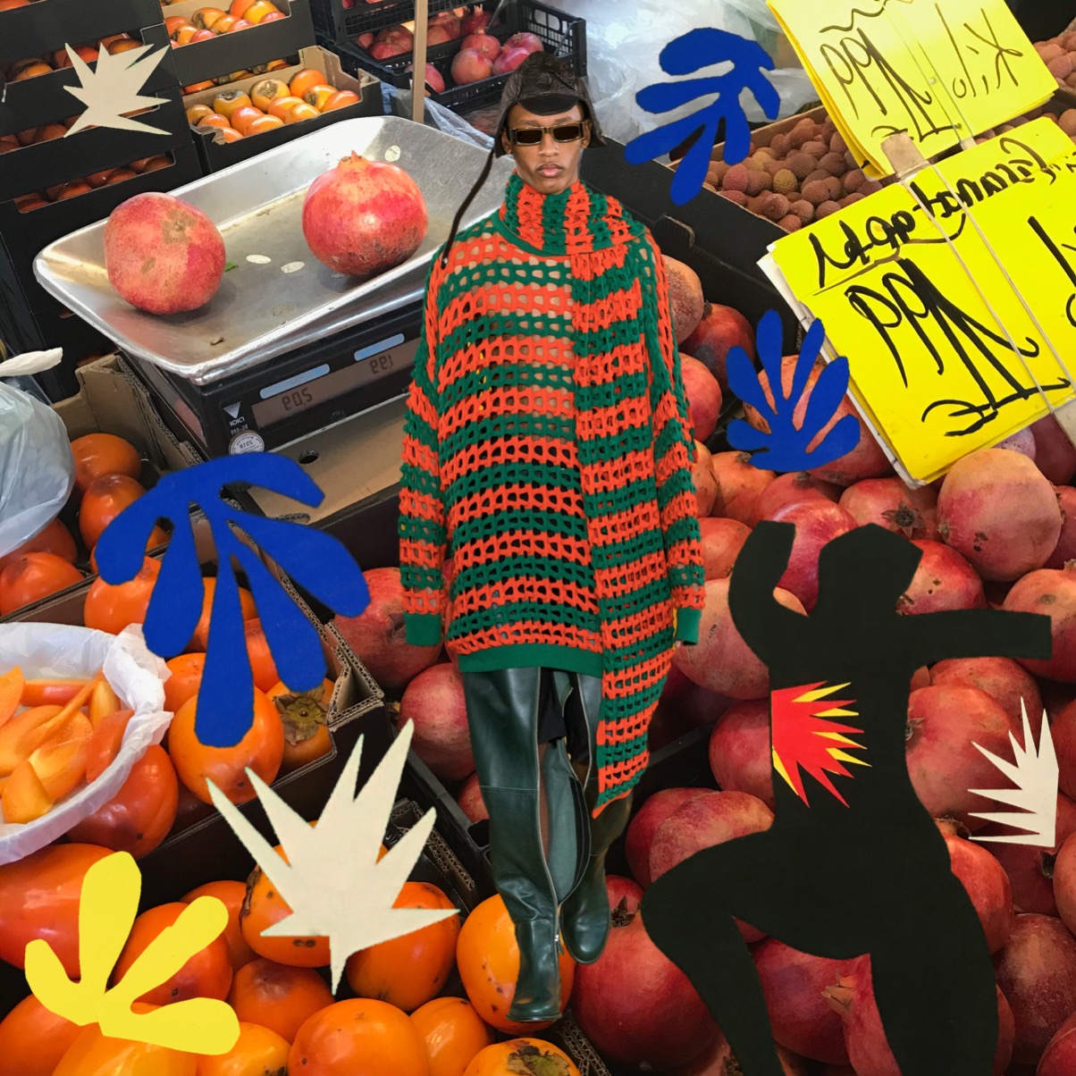 For pre-fall, “the initial talk I had with the team was what would’ve been the ready-to-wear of Bottega when they started to make the bags in the late ’60s and ’70s. Of course, the idea was almost to work on something anachronic – we don’t want to go too literal, it was the idea of a modern time traveler.” The development process involved lots of photo research, including in old Interview magazines – “Andy Warhol loved Bottega,” he explained – to see “how people layered and mixed and matched.” It led to results like the suede skirt layered over suede pants, and the trim crewneck and striped collar shirt tucked belted gray jeans. The spirit he was channeling was “bourgeois, but decontracté,” he suggested, pointing to a checked button-down worn with a leather bomber and a khaki twill pencil skirt, and another checked button-down with a full skirt. There is much more to restlessly drool over in this lookbook: the pastel pant suits, the colorful suede intrecciato separates, the homoerotic-coded bandana bag, and a vibrant horizontally striped knit dress with the nubby pile of a carpet. Each piece is a wearable, meaningful artwork – that might be the ethos of Blazy’s Bottega Veneta.