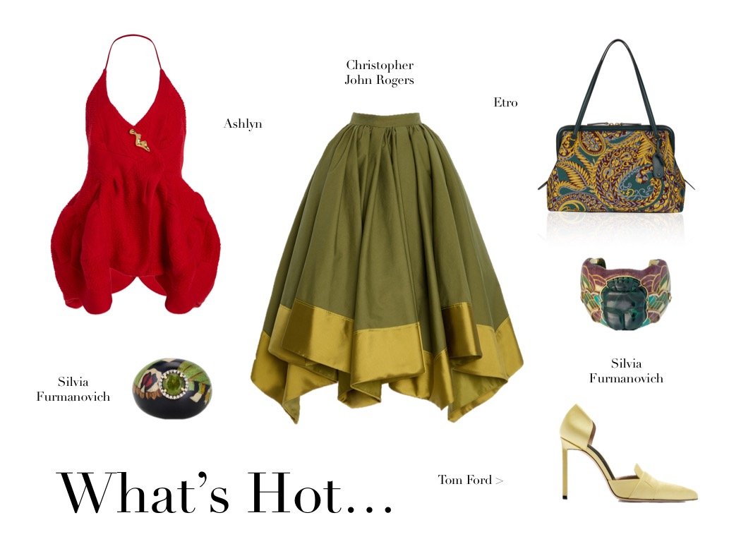 What’s Hot (3.9.25) September 3, 2025 | Design & Culture by Ed GET THE LOOK: Ashlyn Kian Cashmere Cape Blouse Vince Pull-On Full Skirt Etro Mini Arnica Libra Tote Bag TOM FORD Eva D’orsay Glossed Croc-effect Leather Pumps Silvia Furmanovich 18K Yellow Gold Egyptian Marquetry Bracelet with Light Brown Diamonds and Malachite Scarab
